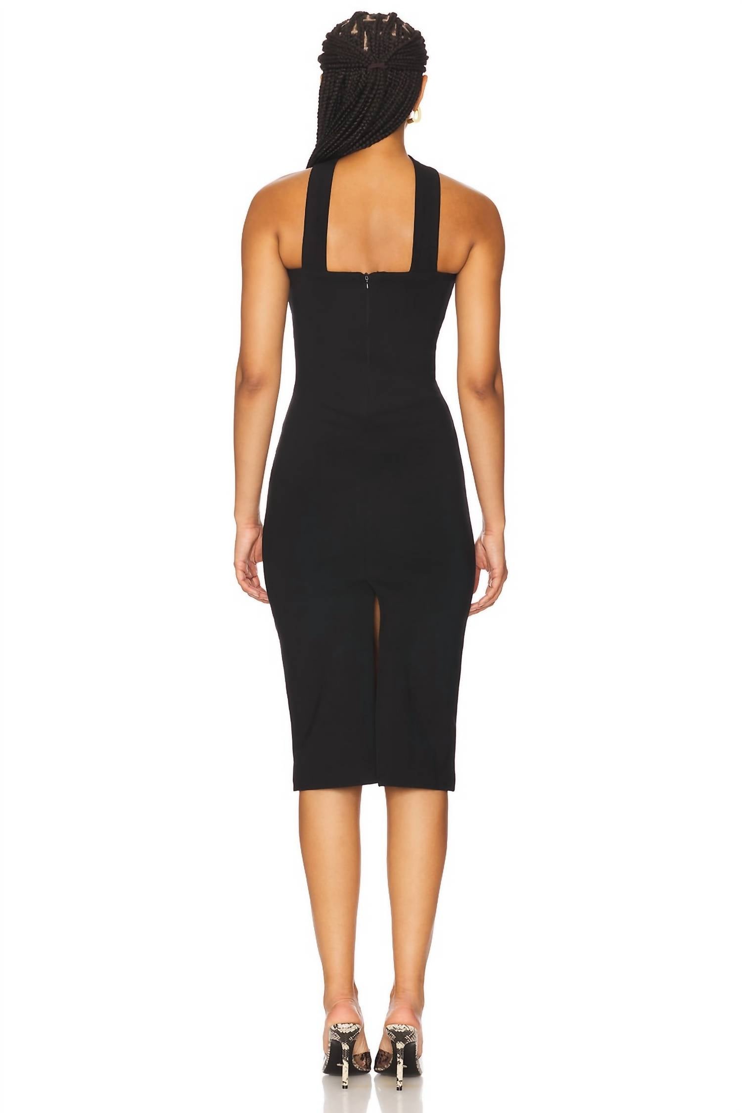Just add slides or mules and you are good to go. Introducing the Kimana Midi Dress by Amanda Uprichard, a show-stopping piece in sleek black for your summer wardrobe. This sleeveless, solid sheath dress features a halter neckline with a chic strap design and a sultry back slit, crafted from a viscose blend (63% Viscose, 32% Polyamide, 5% Elastane). The dress measures approximately 93 cm from neckline to hem, offering a flattering midi length, and is made in China. Closure is a hidden rear zipper and care is required through dry clean only, making it an effortless yet elegant addition to vacation or Valentine’s Day occasions.