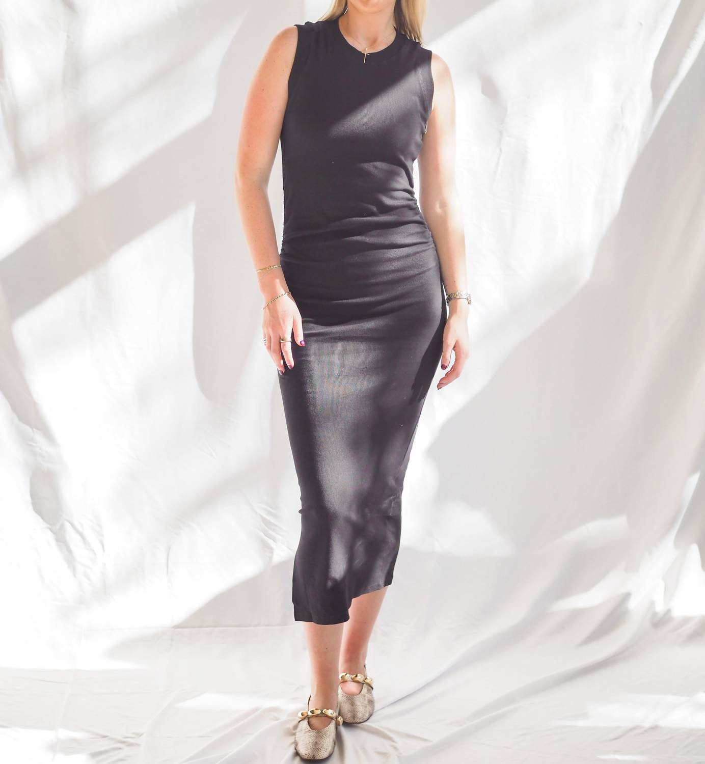 Just add slides or mules and you are good to go. Elevate your wardrobe with the Moderne Rib Knit Dress by Bishop + Young, perfect for a minimalist summer look. This sleeveless bodycon dress comes in a chic black solid pattern and is crafted from a comfortable cotton blend of 95% Cotton and 5% Spandex. Featuring a crewneck design and a pull-on closure, it is made for seamless styling on your next vacation. For care, simply hand wash and line dry to maintain its flattering shape.