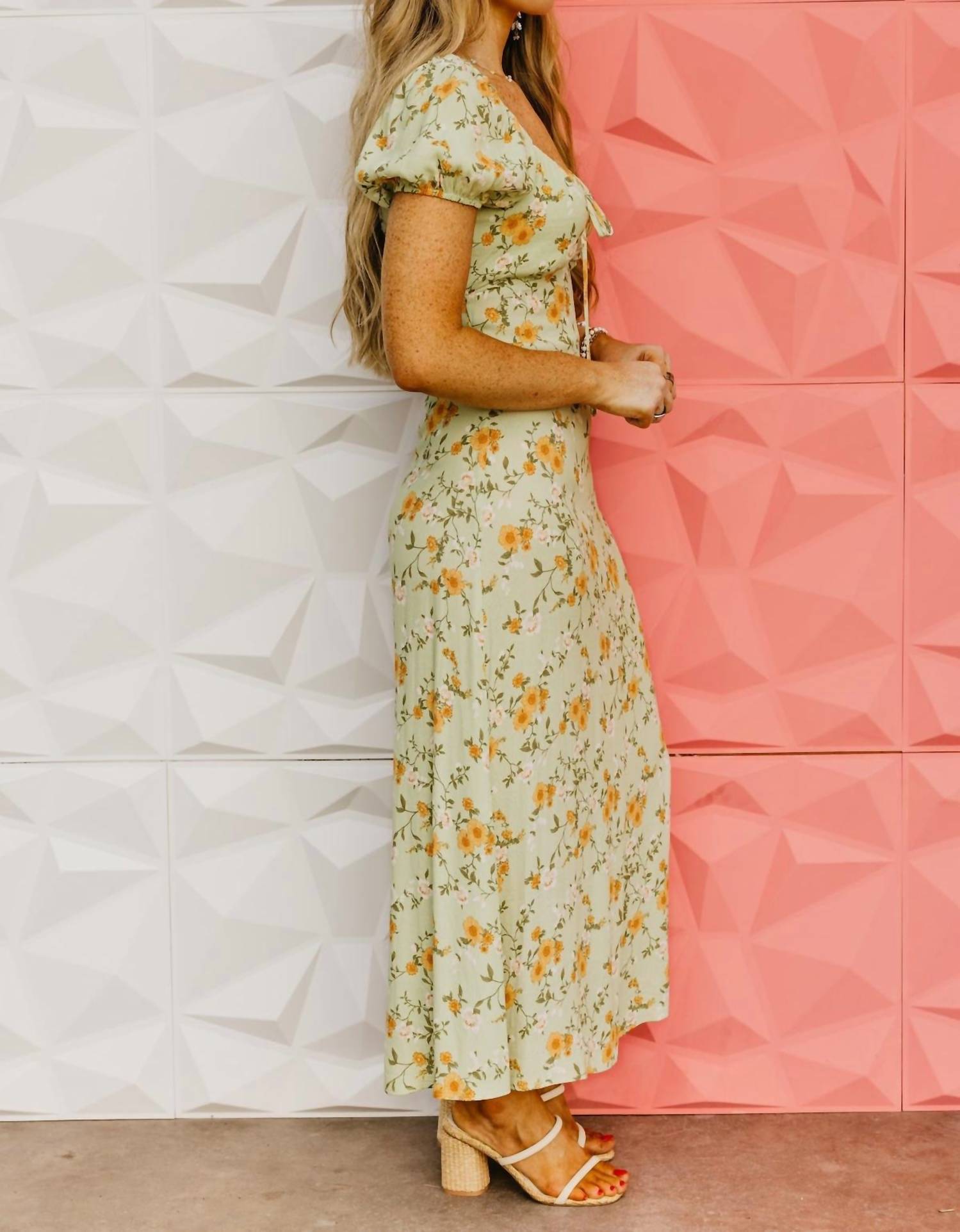 The perfect length dress does exist. Embrace romantic elegance with the Allzae Midi Dress by Blu Pepper, featuring short puff sleeves and a delightful sweetheart neckline. Crafted from 100% Rayon with a fully lined 100% Polyester interior, this sage sheath dress showcases a charming floral print, lending a boho chic vibe. The midi length and front tie detail enhance its feminine appeal, making it perfect for summer gatherings or holiday parties. Closure: Invisible side zipper.