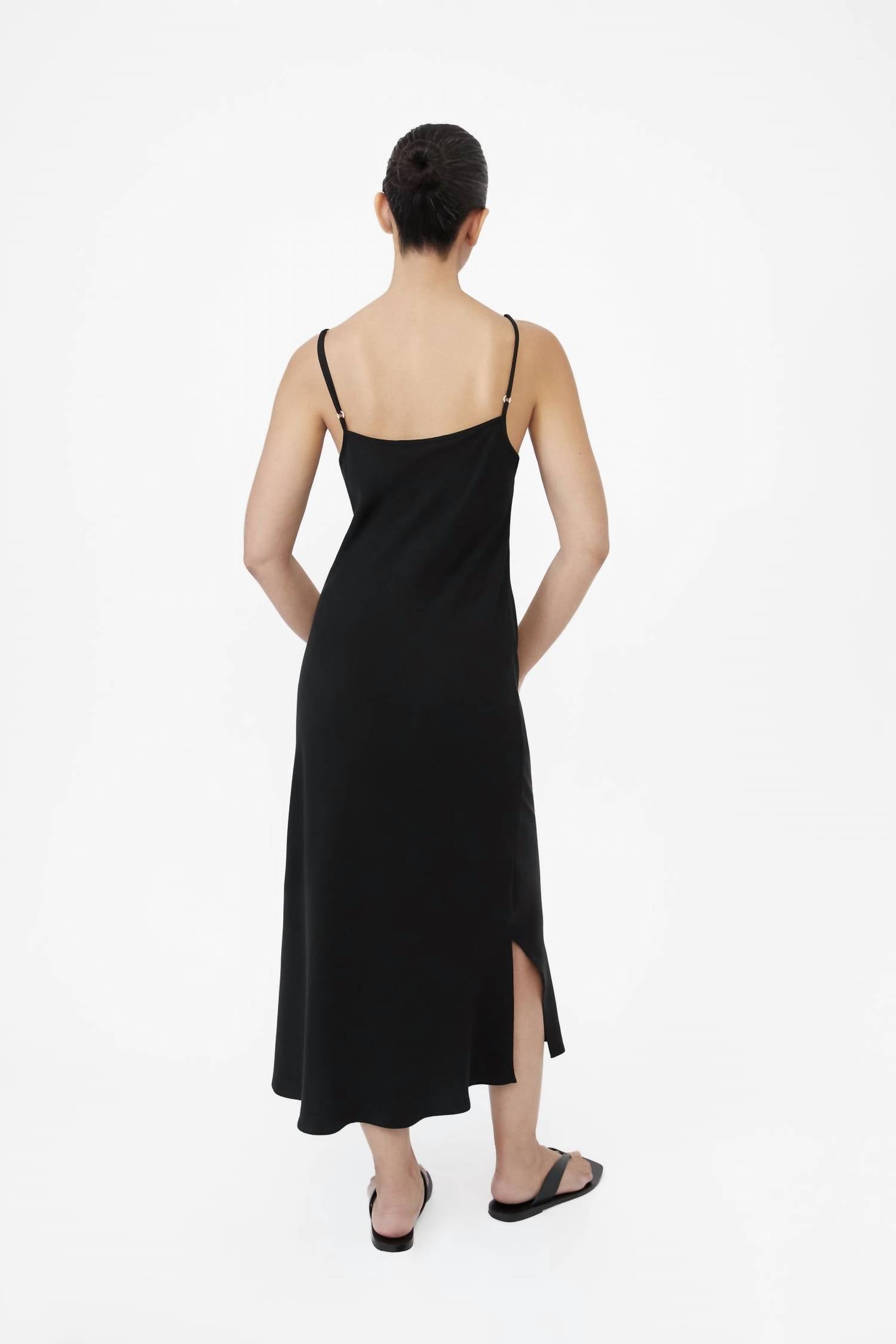 The perfect length dress does exist. Introducing the Cupro Bias Slip Dress by Dāl the Label, a timeless piece in solid black designed for modern elegance. This dress features spaghetti straps and a v-neckline, crafted from luxurious 100% cupro for a silky feel that is breathable and hypoallergenic. With a midi length and sheath silhouette, it offers versatility for any occasion, from casual outings to evening events. Made in an undefined country, this dress is best cared for by hand washing and laying flat to dry, ensuring its longevity in your wardrobe.