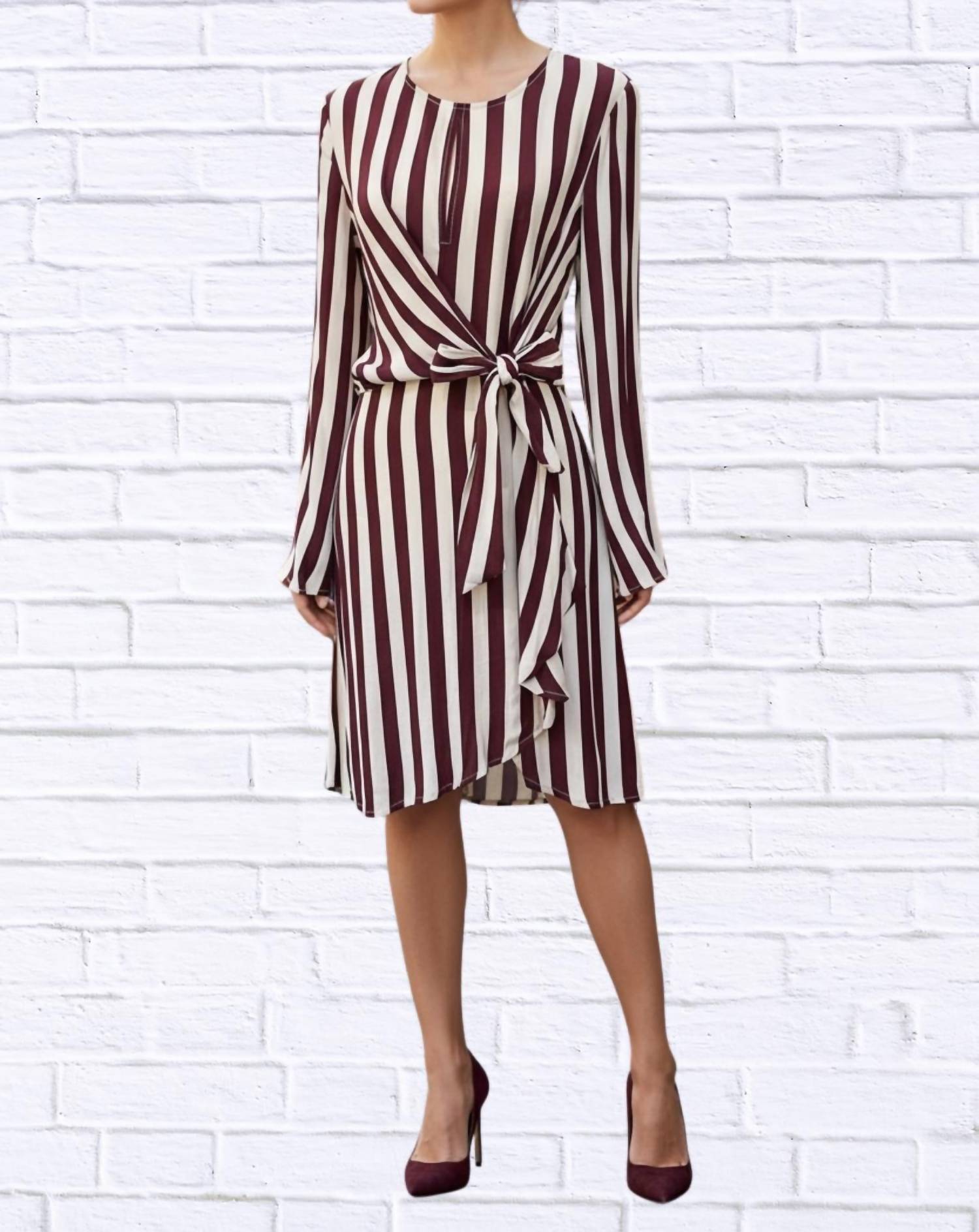 Elevate your wardrobe with the Long Sleeve Wrap Dress by Diva USA, an exquisite burgundy and cream striped piece made to impress. Designed in a flattering wrap silhouette, this knee-length dress is crafted from soft, woven fabric, offering a sophisticated look that's perfect for the office or evening events. It features long sleeves with elegant cuffs and a keyhole neckline for added charm, complete with a side tie closure that elegantly defines your waist. For care, this timeless piece requires dry cleaning to maintain its pristine condition.