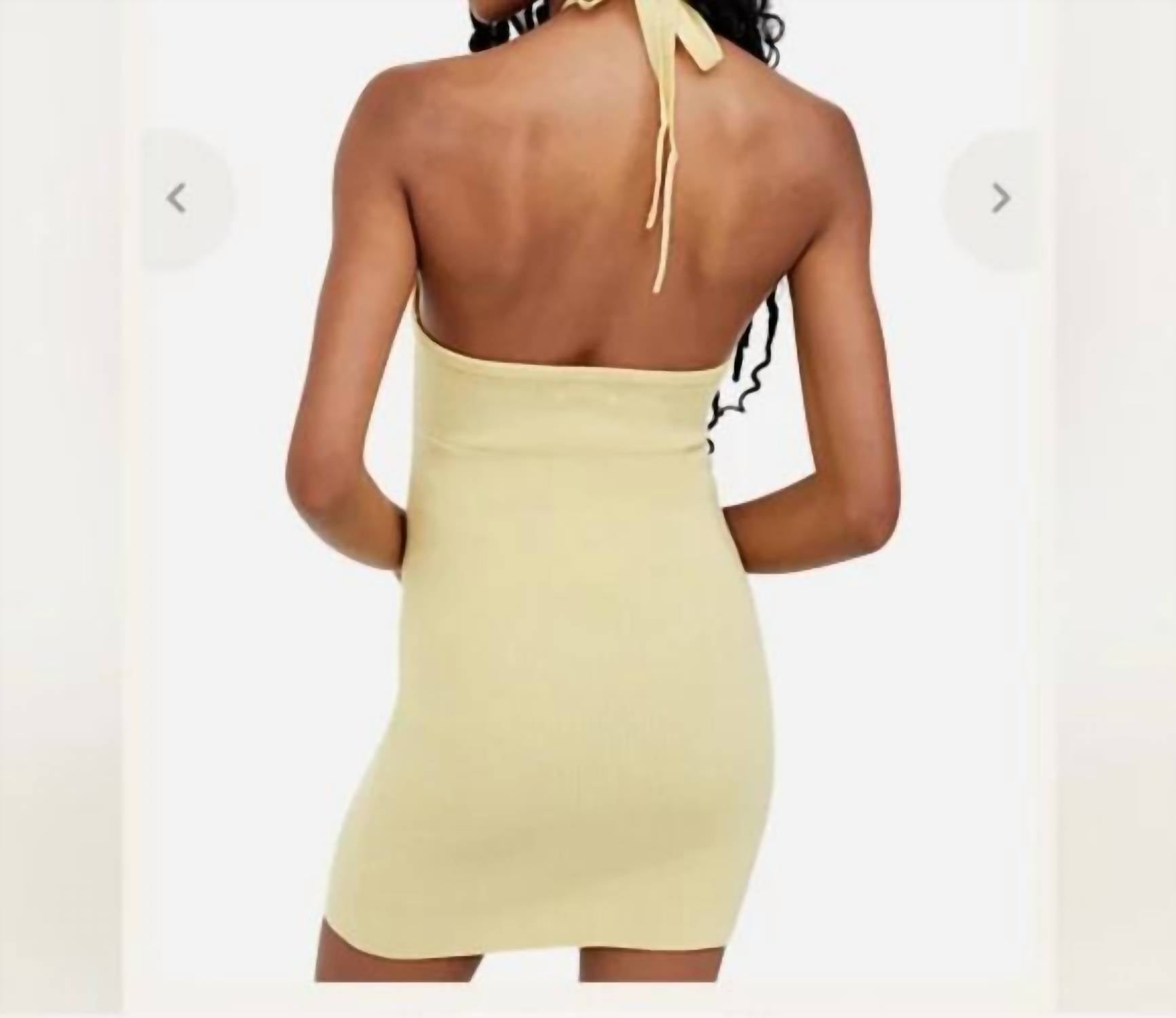 The perfect mini dress for those warmer months. Embrace summer chic with the Mona Mini Halter Dress by For Love & Lemons, a perfect statement piece for cocktail parties. This sleeveless bodycon dress features a halterneck tie closure and a trendy drawstring cut-out neckline for an adjustable fit. Made from a super soft acrylic blend with ribbed knit fabric, this piece measures approximately 25 inches from neckline to hem, showcasing a solid yellow hue. Care instructions recommend dry cleaning for maintaining its imported quality.