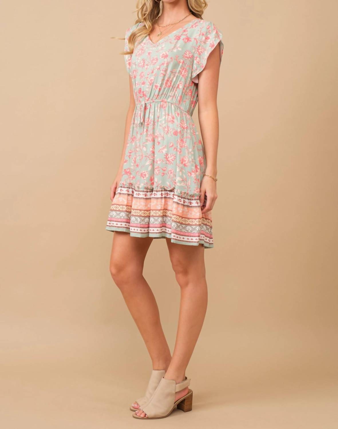 Elevate your spring wardrobe with the Floral Border Print V-neck Dress by Hayden LA, showcased in a charming sage hue. This feminine piece features a cap sleeve design with an elastic waistband and a fixed waist tie for a flattering fit. Crafted from 100% Rayon, it includes side seam pockets for added convenience. With a pull-on closure, it's easy to wear, and for care, hand wash and line dry. Model is 5'10" with measurements 32-24-38, wearing a size small. Perfect for a vacation-ready look with its patterned aesthetic and A-line silhouette.