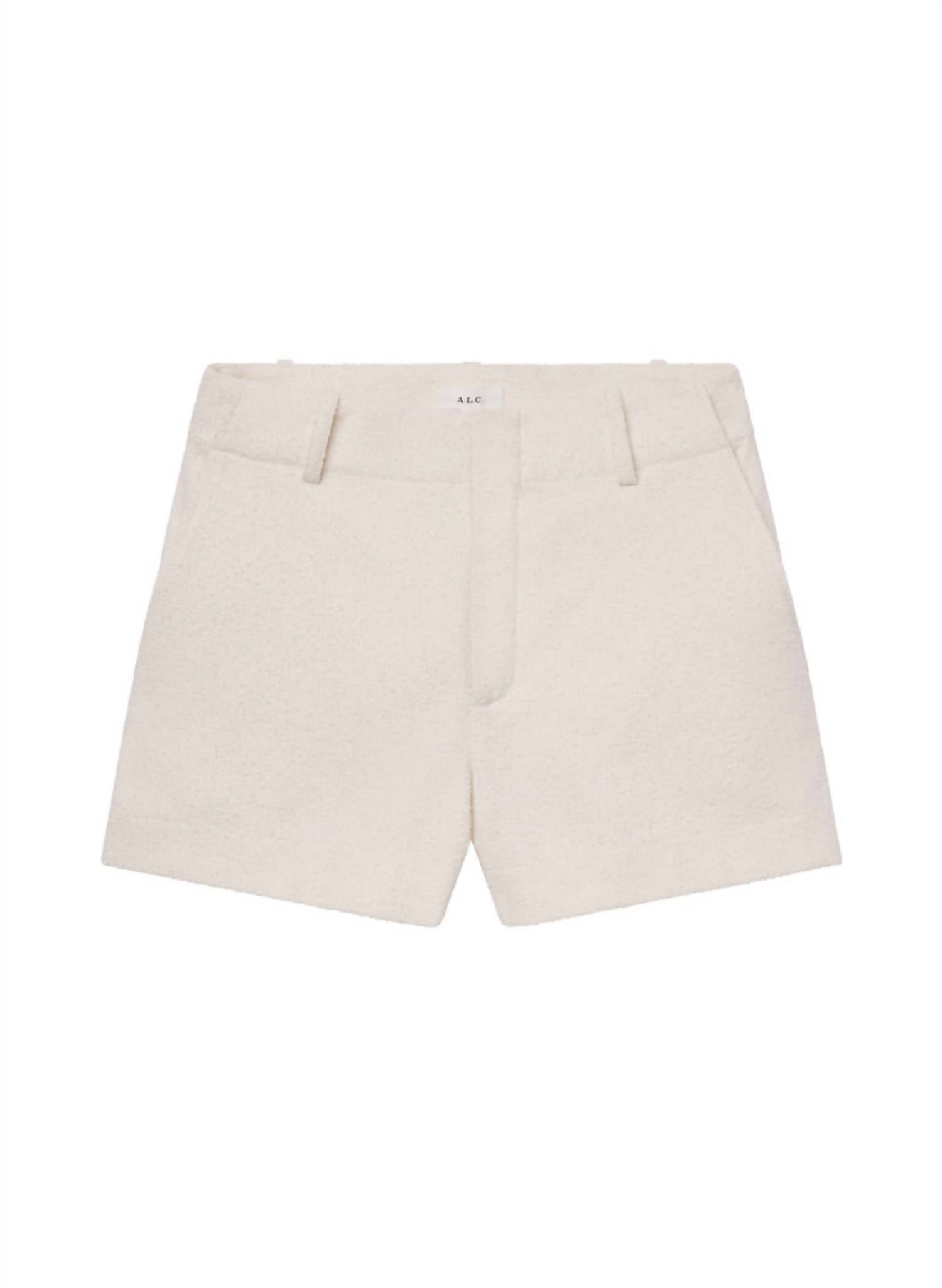 Elevate your wardrobe with the Cade Shorts by A.L.C., crafted in a luxurious Italian tweed with a pearl-white hue. These high-waisted shorts are expertly tailored from a 93% Cotton, 3% Polyamide cotton blend, offering a soft terry-like texture that combines comfort with a polished look. Featuring a rise of 12.5", a 3" inseam, and discreet side pockets, this piece is equally versatile with its zip closure and relaxed cuffed hems. Care instructions recommend dry cleaning, ensuring the longevity of this refined textile, perfect for any fashion-forward closet. Model is 5'10" wearing size 4.