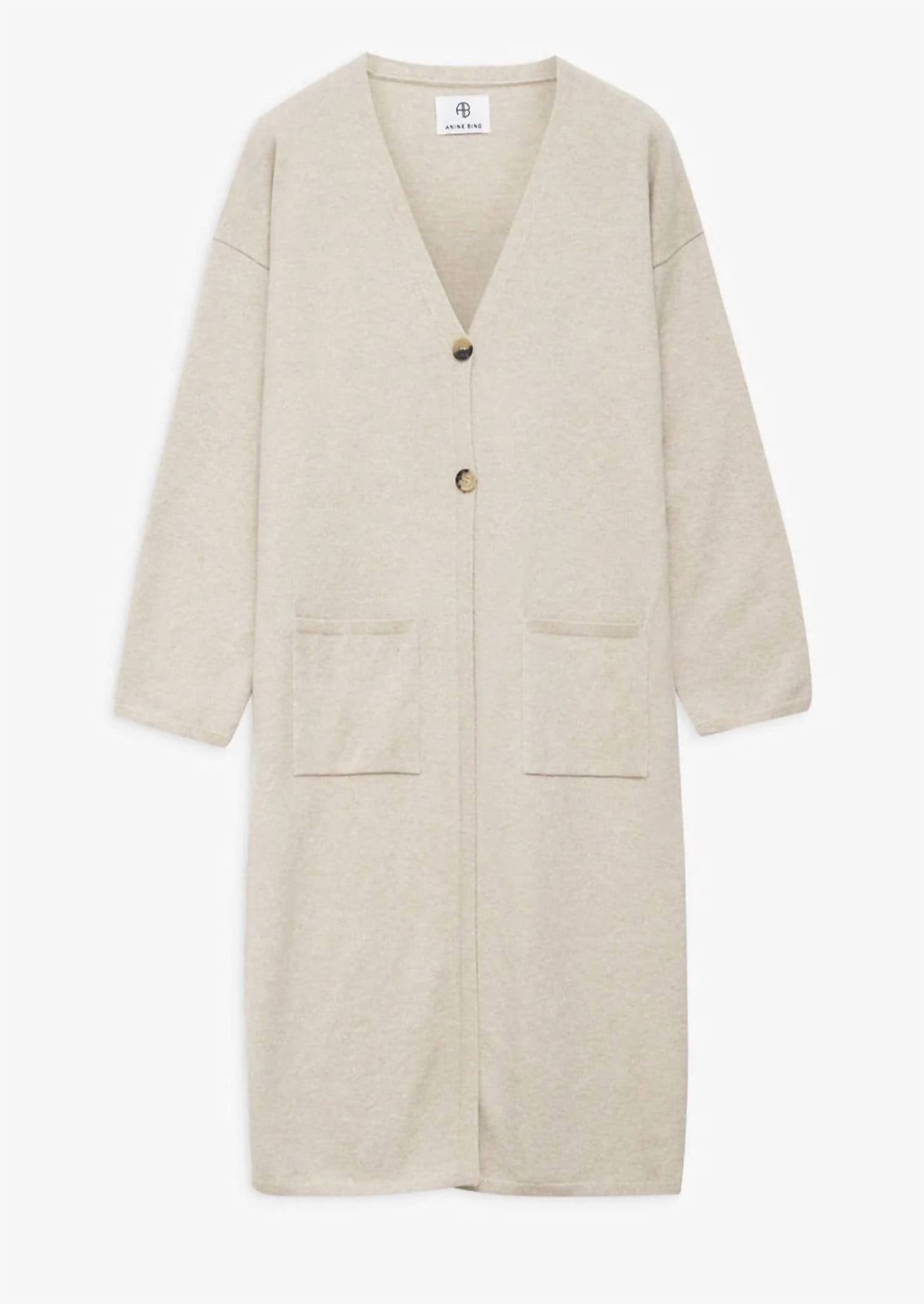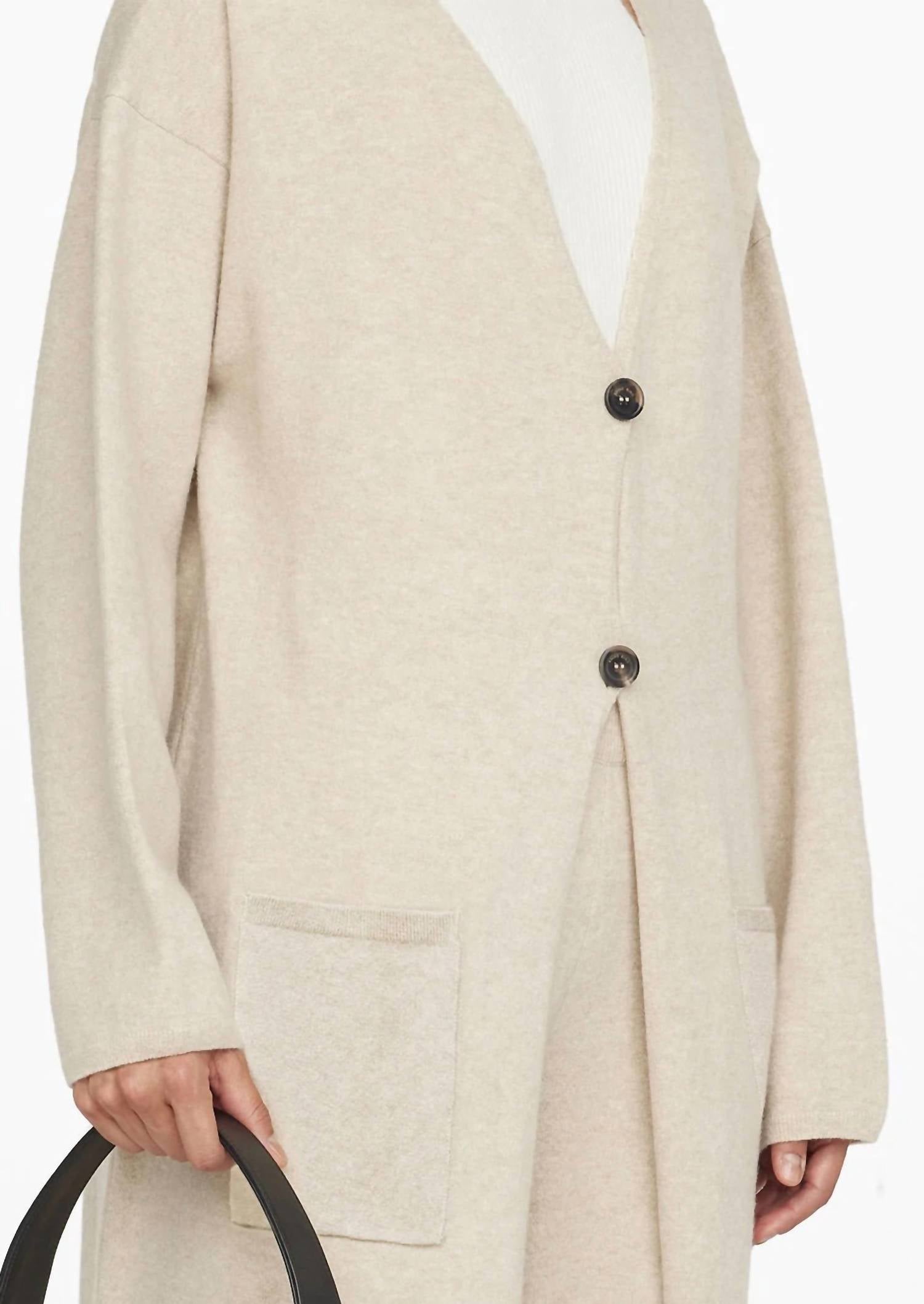 Throw this adorable cardigan over any cami or tank top. Designed by ANINE BING, the Jasni Cardigan in a soft oat hue exudes elegance with its relaxed fit and mid-length hemline. Crafted from a cozy wool blend featuring 93% wool, 6% nylon, and 1% spandex, this textured long-sleeve cardigan includes knitted patch pockets and a sophisticated V-neckline. Length: 45.5" (size S). It is adorned with two horn buttons for a central closure, making it a chic addition to your wardrobe. For care, dry cleaning is recommended to maintain its luxurious feel.