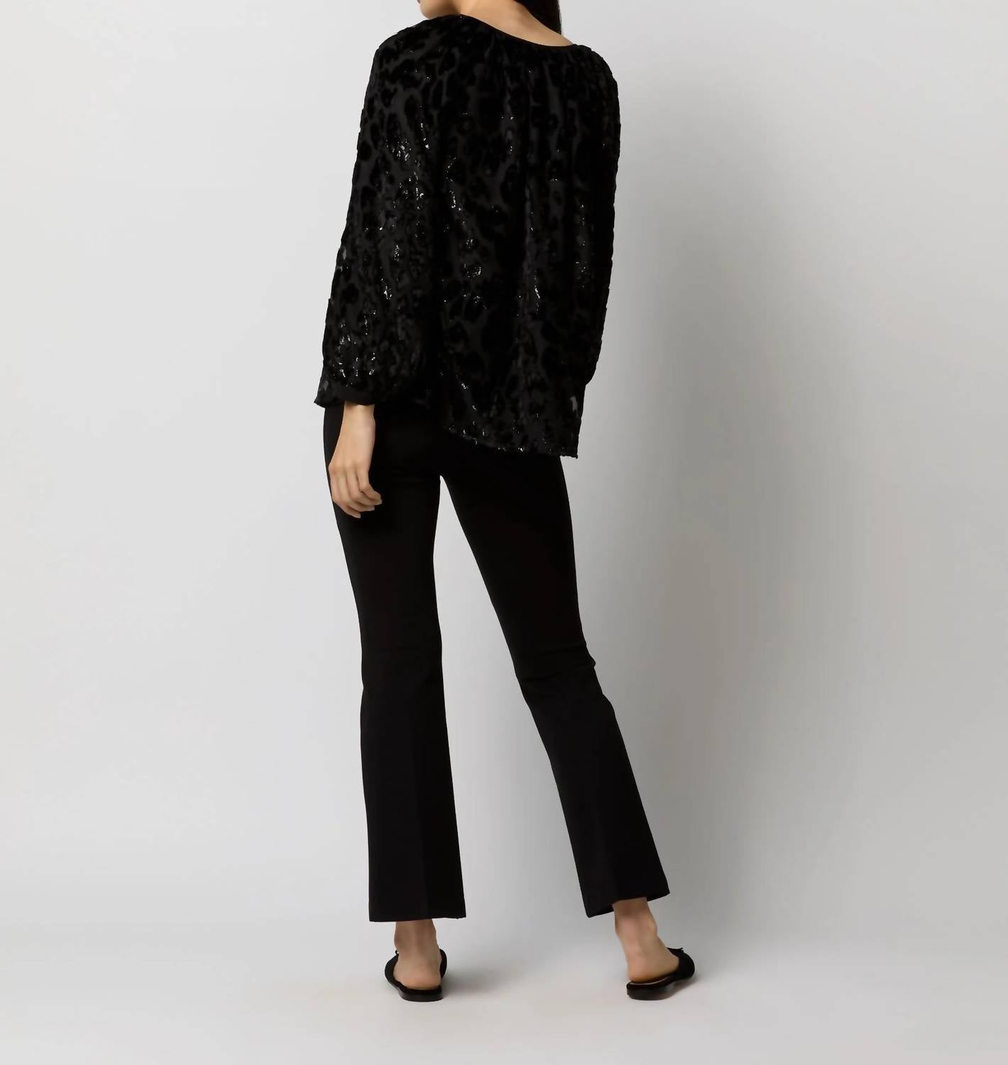 A timeless blouse that will never go out of style. The Ariana Blouse by Ann Mashburn offers a sophisticated twist on the classic silk blouse, featuring long sleeves and a luxurious Italian fil-coupé georgette material in a chic two-dimensional black leopard print. Its button closure complements the elegant V-neckline, with a hook-and-eye option providing versatility. Crafted from rayon, this top exudes femininity with drapey puffed sleeves and an easy fit. Care for the blouse by dry cleaning to keep it looking its best for every dinner party or Thanksgiving gathering.