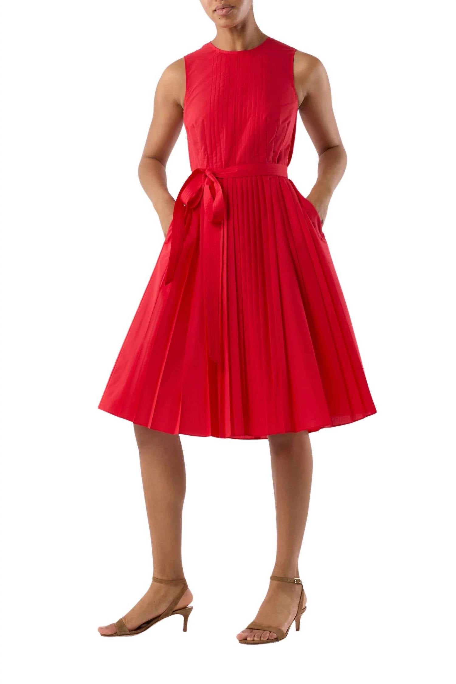 A midi dress so versatile, your options for wearing it are endless. Introducing the Joelle Midi Dress by Ann Mashburn, an elegant navy piece perfect for a holiday party. This sleeveless, A-line dress crafted from a cotton blend showcases sophisticated pleat work and solid pattern. Originating from a classic design, it features a practical zip closure and a timeless crewneck. For longevity, please note it requires dry cleaning only.