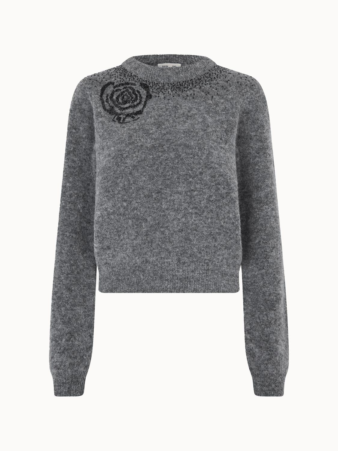 Experience the perfect blend of comfort and style with this trendy crew neck sweater, designed to effortlessly elevate your wardrobe. Pair it with your favorite denim and loafers for the perfect look. Introducing the Women's Chanya Sweater by BAUM UND PFERDGARTEN, an elegantly crafted piece perfect for a stylish fall ensemble. This long-sleeve sweater in washed black boasts a relaxed fit and features intricate beaded detailing at the neck. Made from a luxurious blend of 32% alpaca, 32% merino wool, 30% polyamide, and 6% elastane, it offers warmth and comfort with a textured crewneck design. Designed as a pull-on style, it pairs seamlessly with your vacation and streetwear looks.