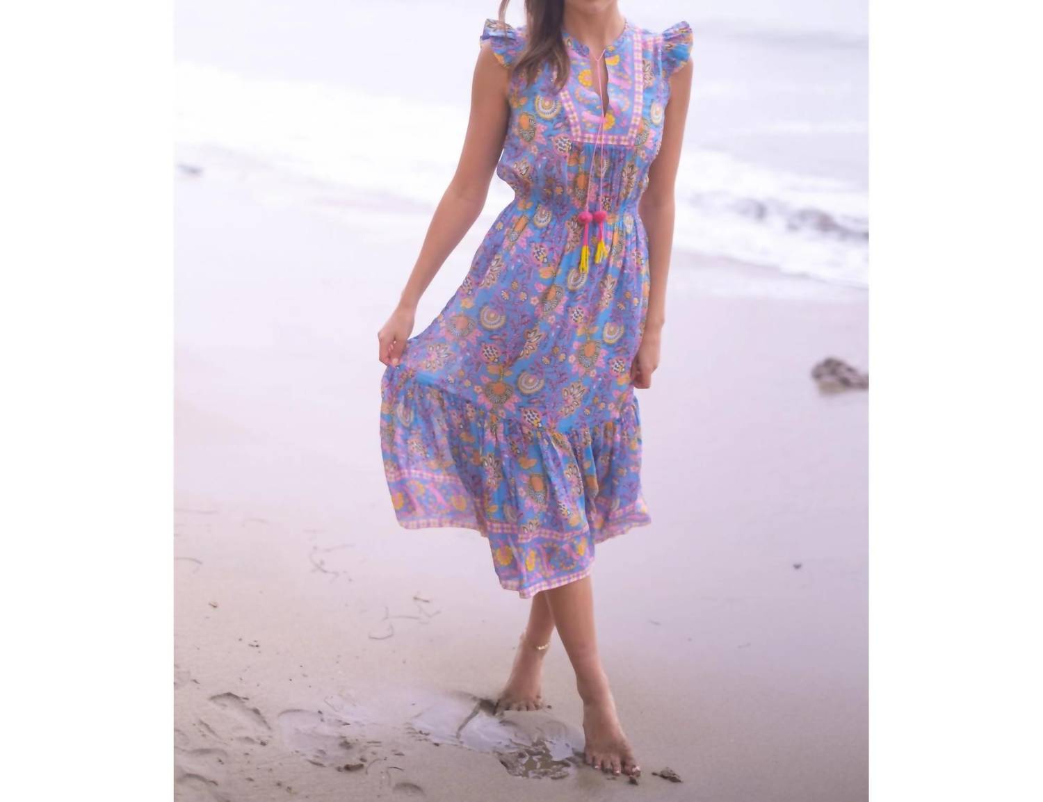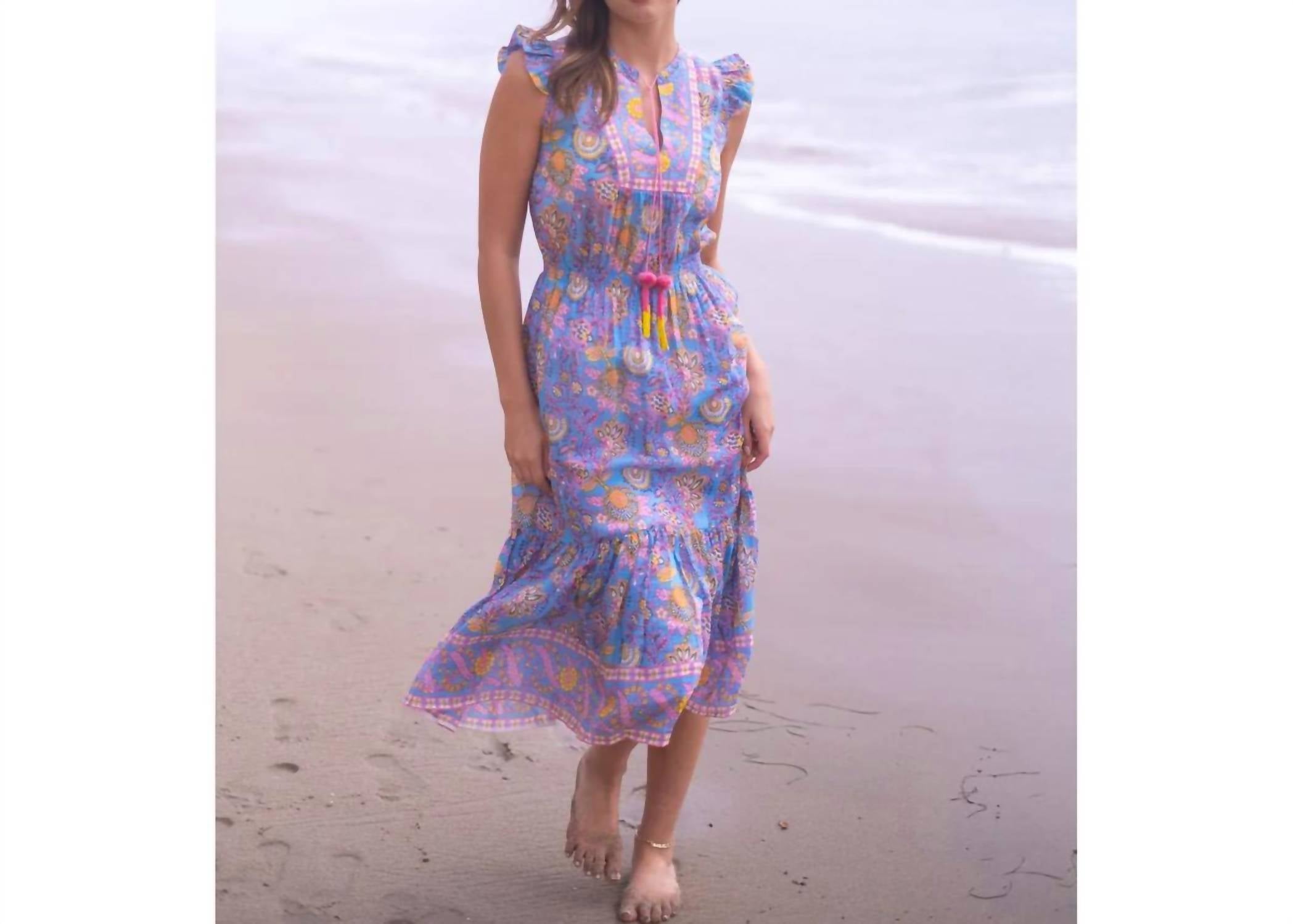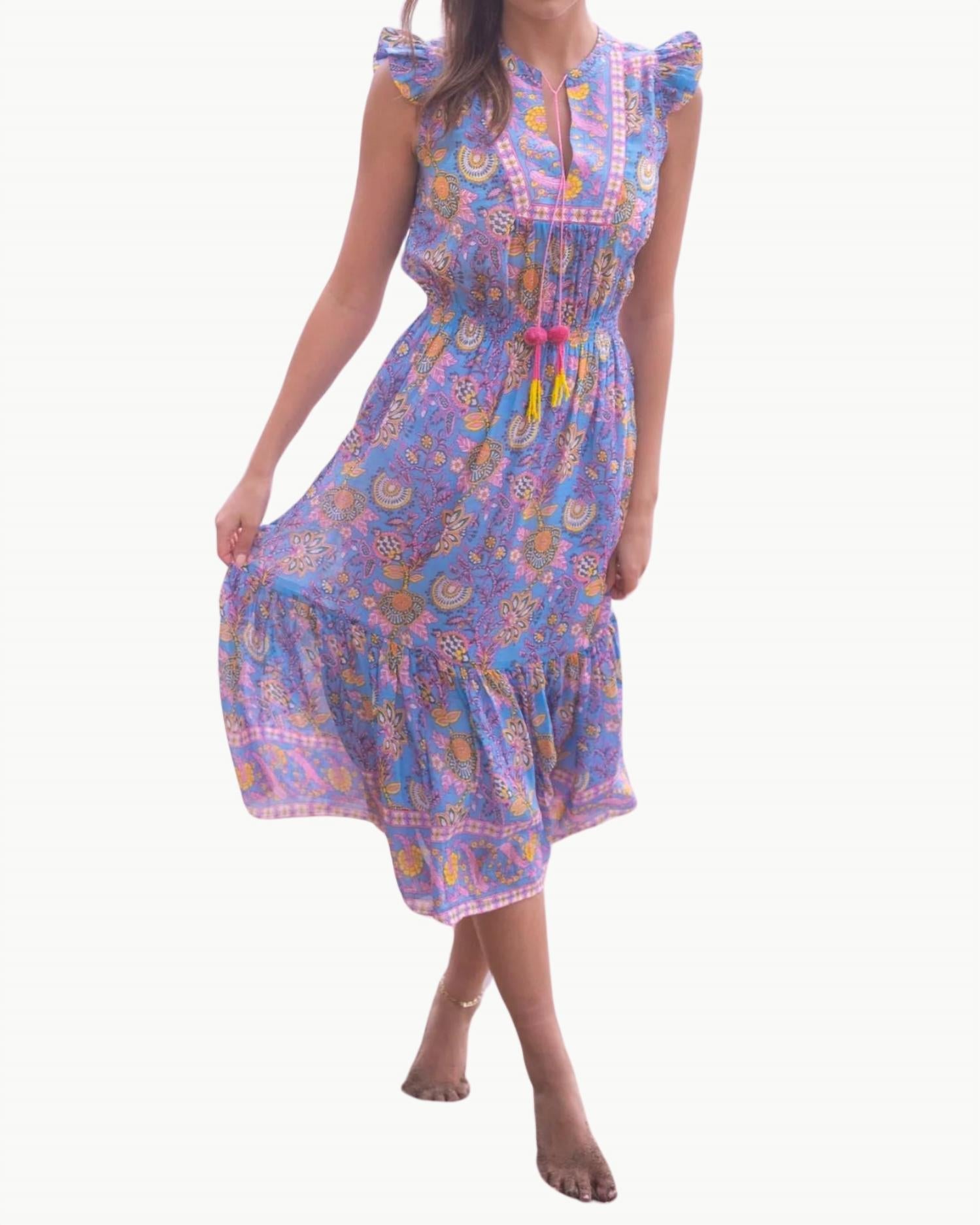 A midi dress so versatile, your options for wearing it are endless. Infuse your summer wardrobe with breezy femininity through the Lola Midi Dress by BELL, designed in a captivating Blue Yellow Print. Featuring cap sleeves, this dress combines an artisanal hand-blocked floral pattern with a graceful midi length and relaxed bell shape for effortless flow. Crafted from silk cotton voile, it ensures a lightweight and breathable feel, enhanced by delicate ruffle details and handmade tassels. Closure is secured with a tie closure. Perfect for a boho chic vacation look.