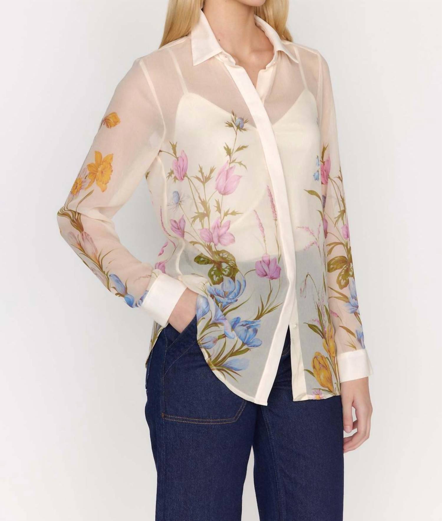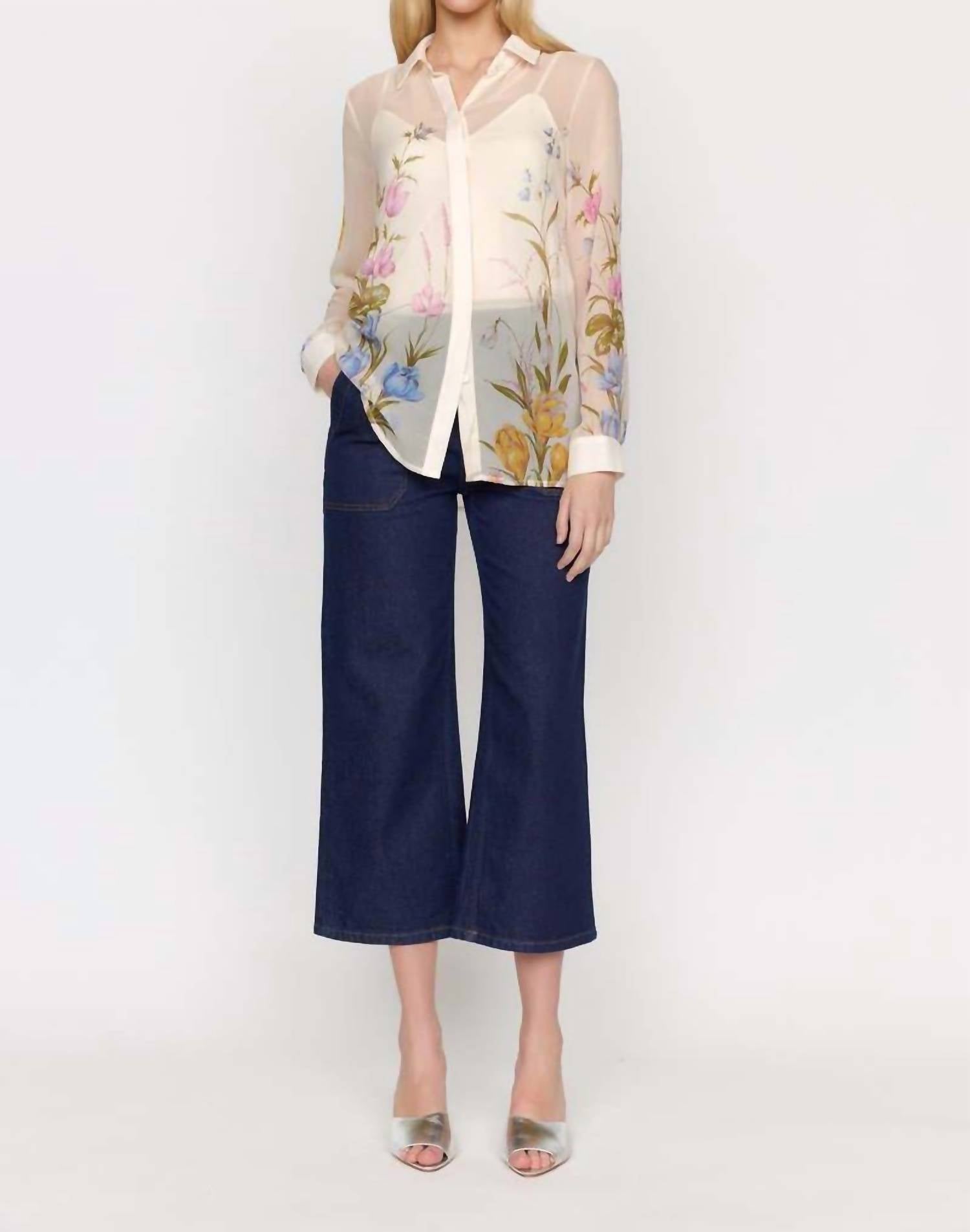 Pair this with your favorite jeans and slides for your next girls night out. Christy Lynn introduces a slim fitted button-up blouse featuring a whimsical floral print that captures the essence of effortless beauty and timeless elegance. This blouse features a delicate collar and cuff and has mother-of-pearl buttons for closure under the hidden placket and at the sleeve cuffs. Ships with a nude slip. Composition: 100% Crinkle Silk Chiffon Care: Dry Clean Only Imported.