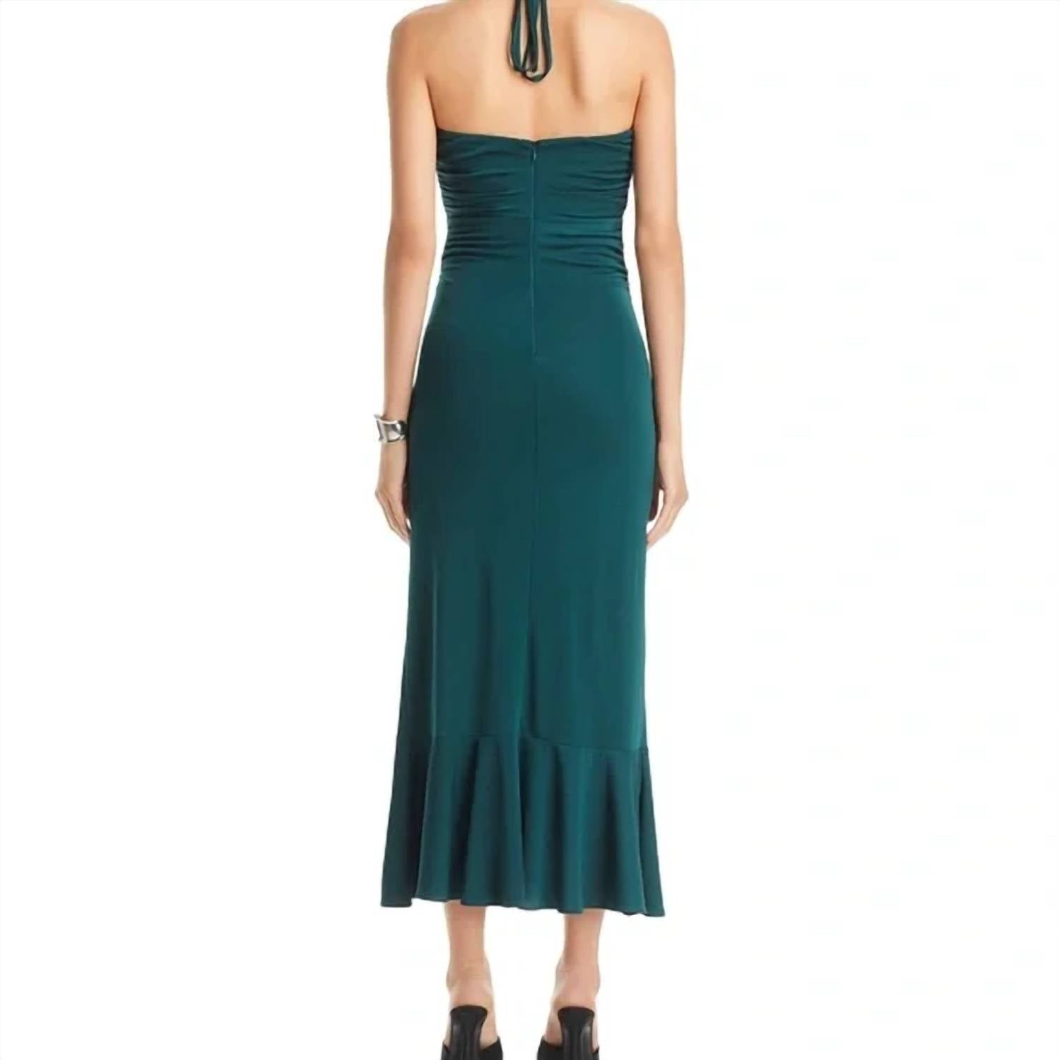 Just add slides or mules and you are good to go. Bandeau neck • Back zip closure • Center halter straps tie at back neck • Ruched at center bodice and hips • Cascade ruffle trim at front • Bodycon silhouette • Ruffle-trim cutaway hem