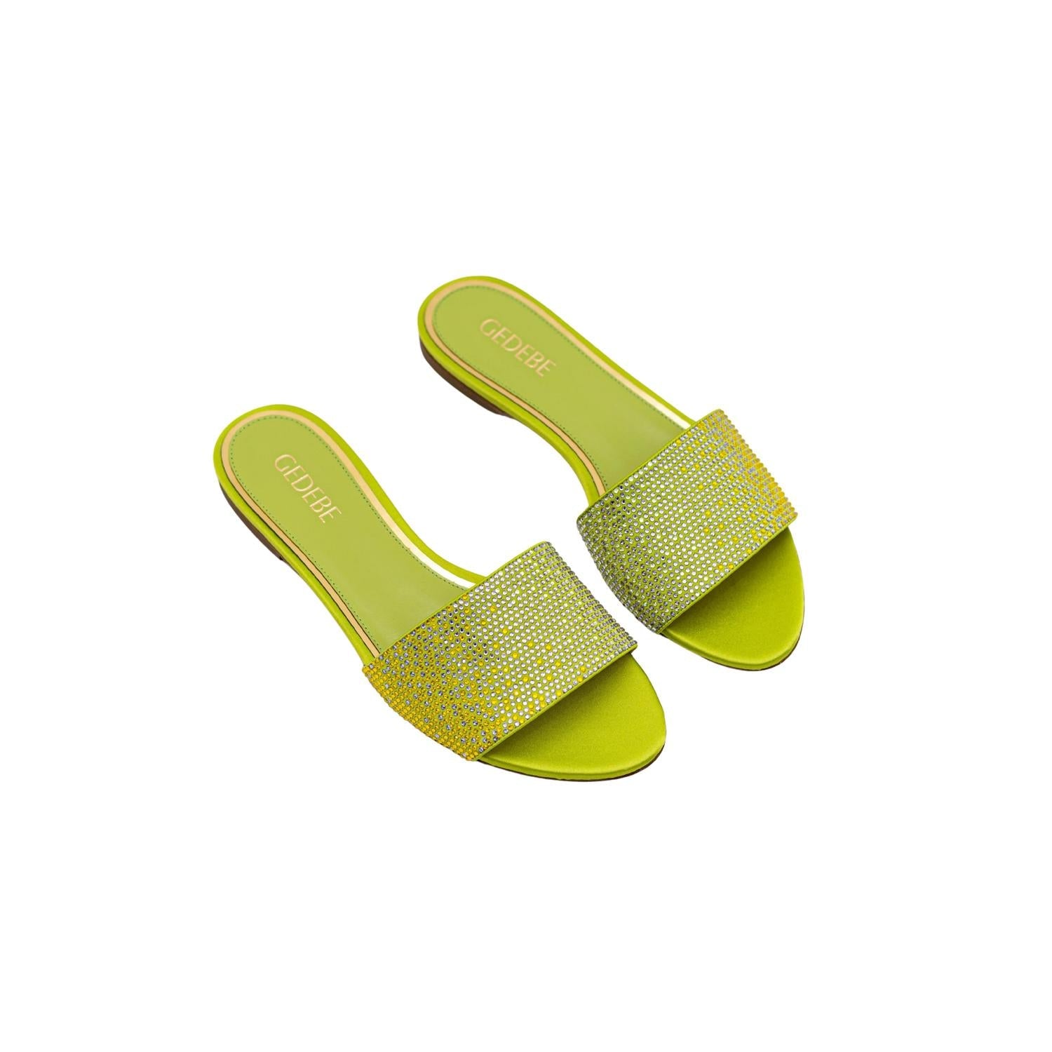 A preppy yet feminine take on the classic loafer. Step into summer luxury with the Women's Cassis Satin Rhinestone Embellished Flats by Gedebe. These vibrant lime flats feature a maximalist design perfect for a vacation, adorned with stunning crystal embellishments. Offering a classic round toe shape and a comfortable medium width, these flats are crafted with a flat heel under 1 inch for all-day wear. Ideal for embracing bold trends, these satin flats are a must-have for any wardrobe.
