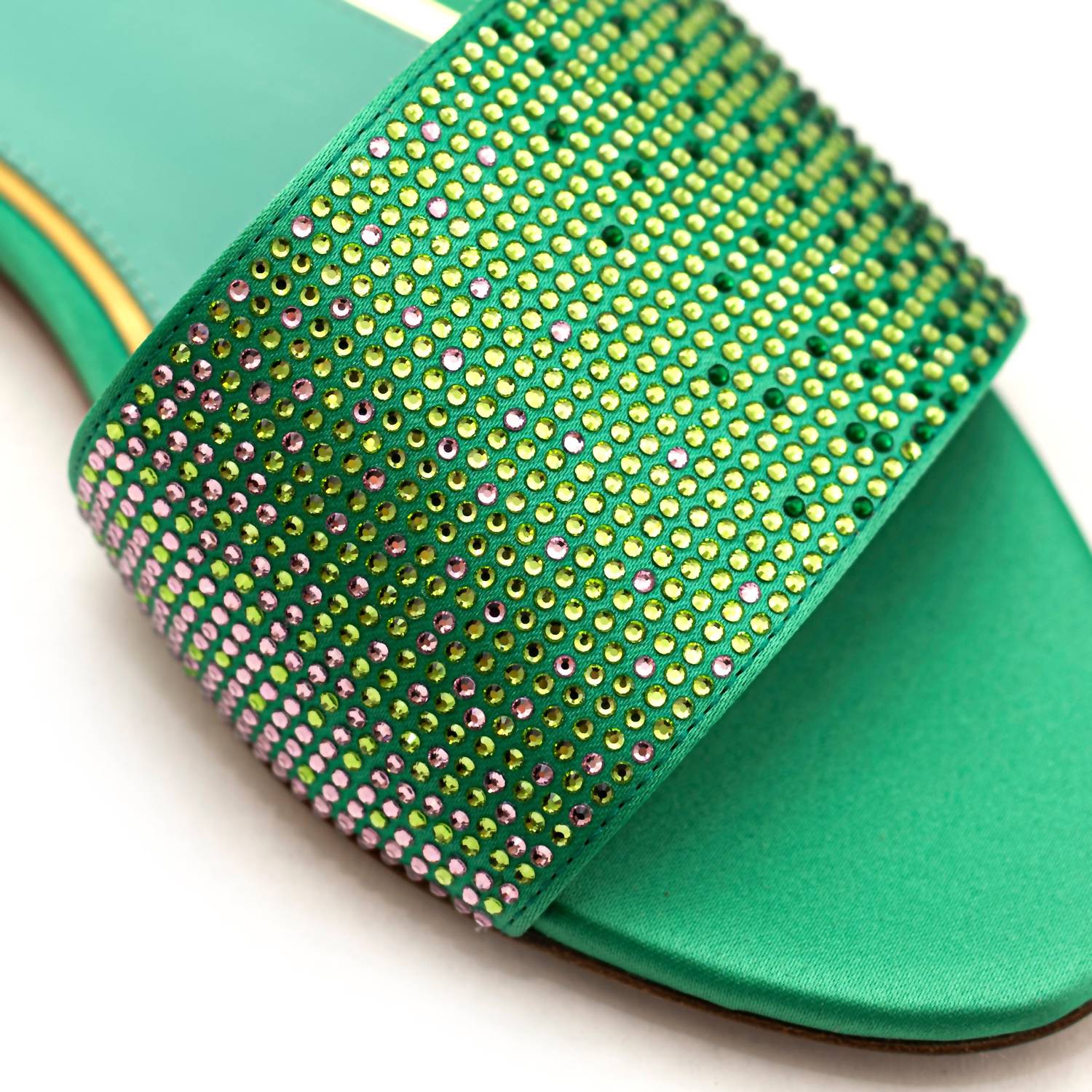 A preppy yet feminine take on the classic loafer. Discover the Gedebe Women's Satin Rhinestone Embellished Flats, a standout choice for any summer vacation or New Year's Eve celebration. Crafted with a satin upper, these flats feature a medium width and a round toe shape for comfortable wear. Designed in a vibrant green, these maximalist flats are set on a flat heel under 1” high, perfect for all-day wear. Ideal for elevating your flat style, these shoes effortlessly blend luxurious embellishments with ease of movement.