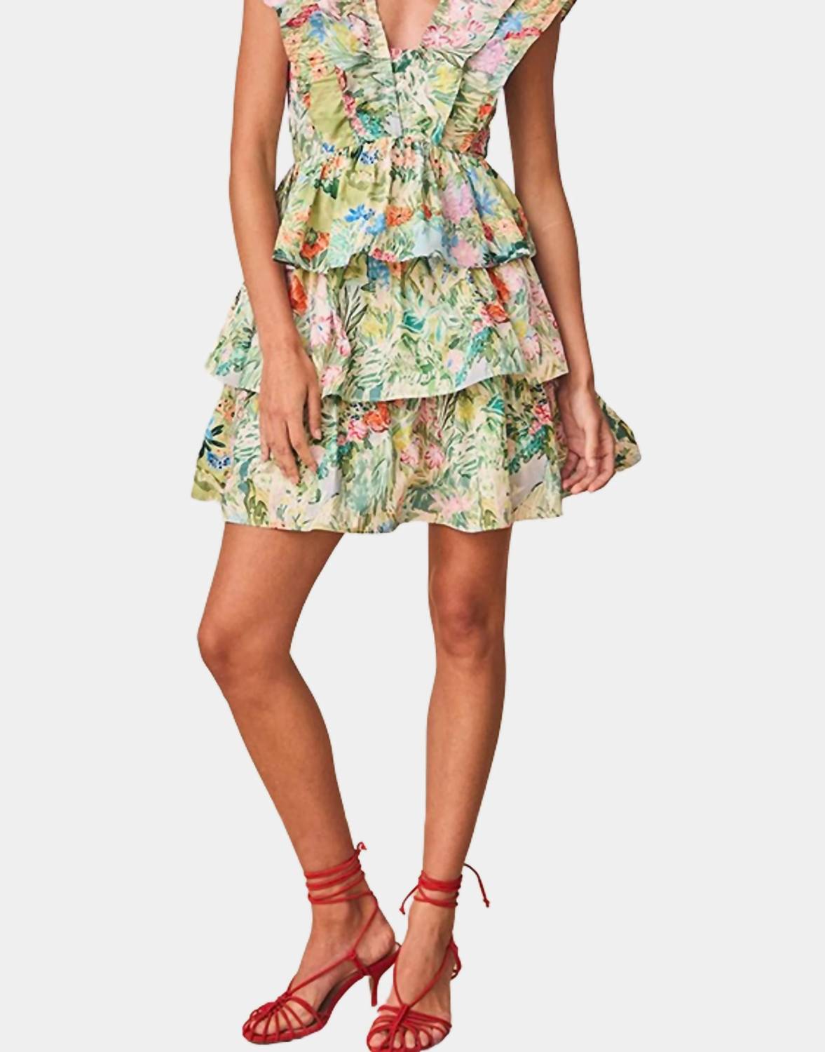 A short and breezy dress for those warmer days. Vibrant Garden Party floral pattern, perfect for your next holiday party. Captivating mini dress features cap sleeves and a flattering V-neck, accentuated by cascading taffeta tiers. Designed with a classic A-line silhouette. Includes an angled empire waist and pleated tiered skirt for impeccable movement. Crafted from lightweight 100% polyester taffeta. Offers a pull-on closure. Care instructions recommend hand washing to maintain its fresh boho chic appeal.