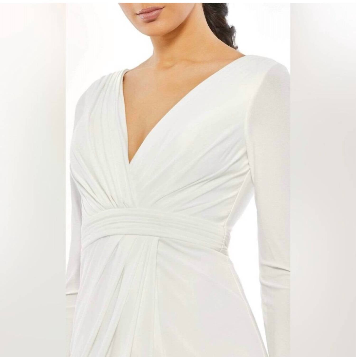 Cute and comfortable, this long sleeve dress has it all. Dazzle in the Long Sleeves Side Split Gown by Ieena for Mac Duggal, a minimalist masterpiece in solid white. Crafted with long sleeves, this elegant piece features a full-length column skirt with a dramatic thigh-high side slit, perfect for making a statement. Made from 100% polyester, it incorporates delicate pleats and draping with a sophisticated surplice V-neckline. With a hidden back zip closure, this gown is both chic and practical, and is recommended for hand wash care.