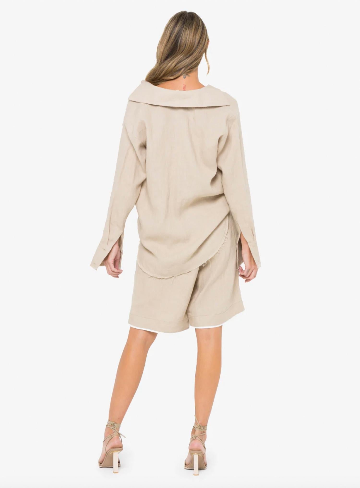 This button down shirt is comfortable yet polished. Discover the Beckett Button Down Shirt by JBQ, an elegant addition to your wardrobe in sophisticated Indigo Shibori. This women's shirt features long sleeves and a classic collar, accentuated by wide banded cuffs and raw edge hem details. Crafted from 100% polyester, it is made in the USA from imported materials with a relaxed fit. Closure: Button closure. Care: Hand wash and line dry for best results. Pattern: Polka dot.