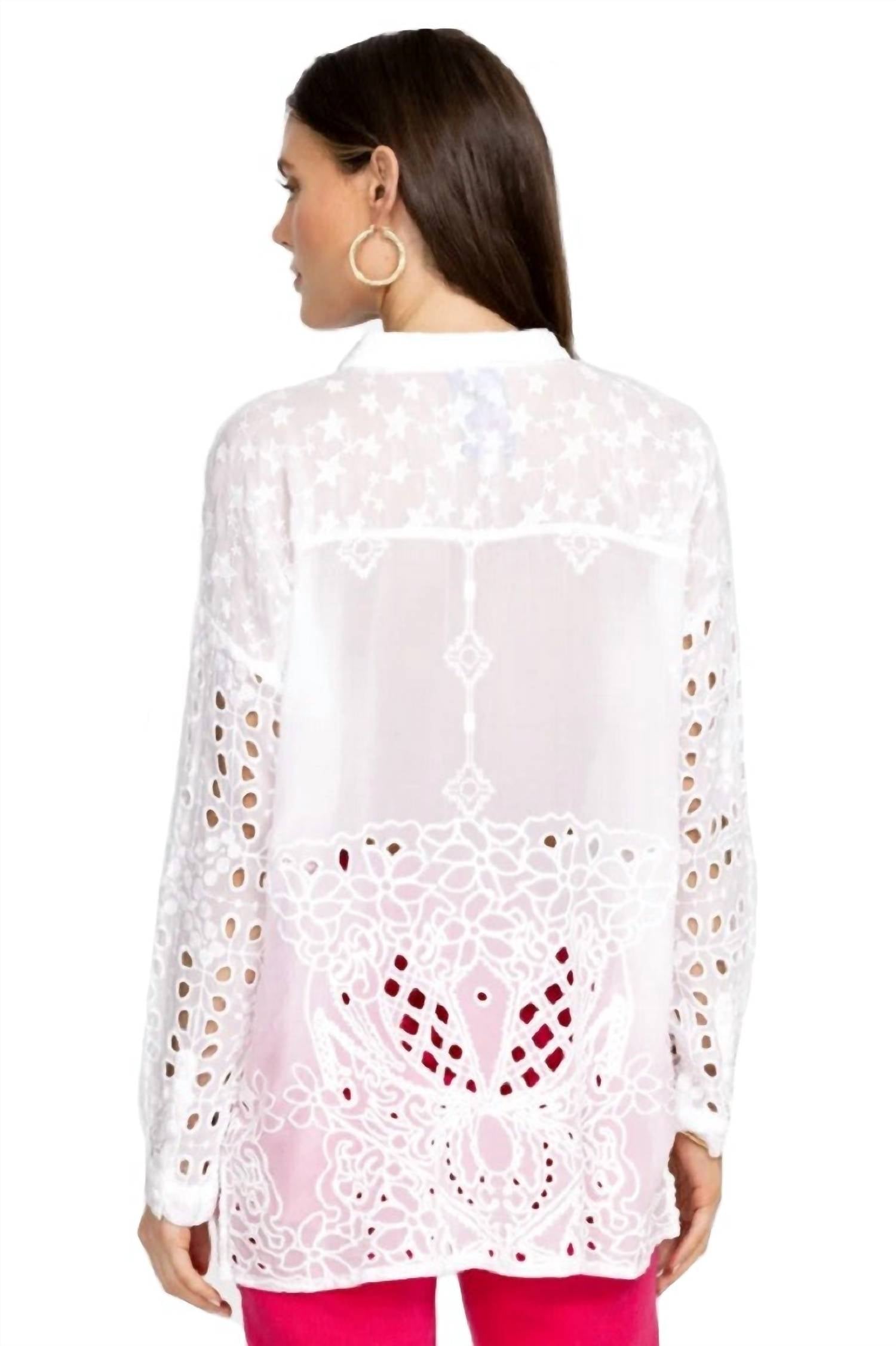 Perfectly tailored and soft to the touch. This button up is made from comfortable rayon and boasts a collar, long sleeves, a complementing mix of subtle patterns, and a standout embroidered design along the sleeves. 100% Rayon. Thread Covered Buttons. Measurements for Size Medium: Length- 28 3/4", Bust- 47 1/2". Machine wash cold only. Non chlorine bleach when needed. Tumble dry low. Warm iron.