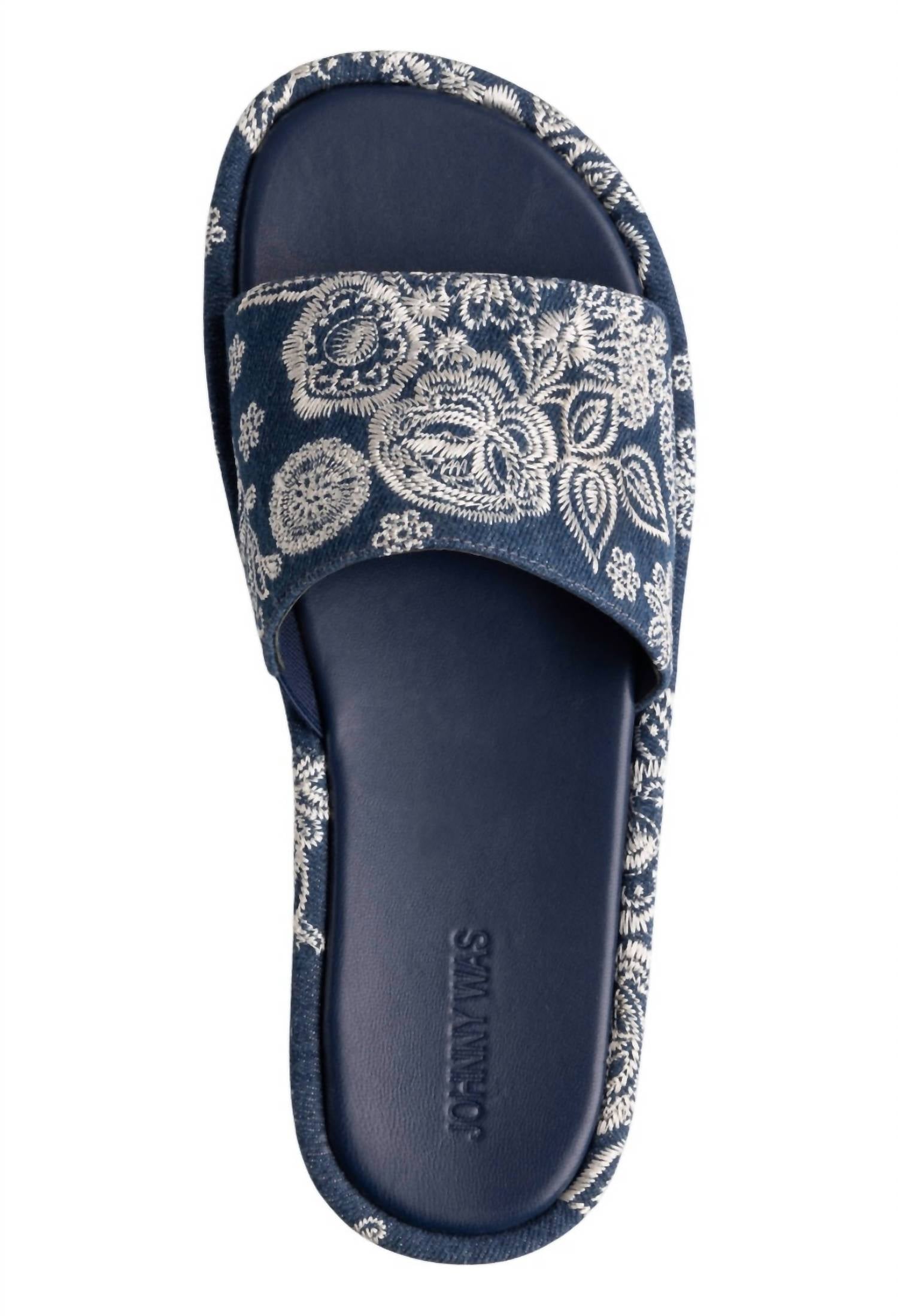 Flowy dresses, cropped pants, and even jumpsuits... this sandal works with them all! Elevate your casual style with the Women's Bandana Embroidered Platform Slide Sandals by Johnny Was. These stylish sandals feature a denim fabric upper adorned with an intricate bandana pattern, crafted from 100% leather. In a versatile denim blue, they pair perfectly with a chic summer outfit. Care instructions recommend spot cleaning with a dry cloth to maintain their pristine condition.