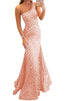 Perfect blend of elegance and modern style for special occasions. Sleeveless mermaid gown features a fitted bodice with illusion sides and a one-shoulder neckline, complemented by a floor-length skirt embellished with sequin-adorned mesh. Made from jersey fabric, secured with an invisible back zipper. For a fresh look, ensure to spot dry clean only.