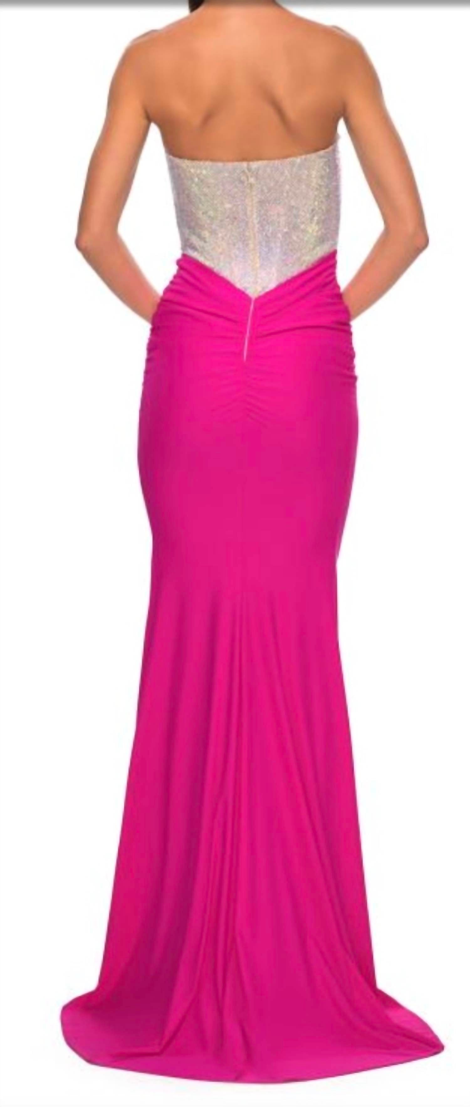 Say 'I do' in style and let your personality shine through in this elegant and timeless dress. With its classic silhouette, this is the perfect wedding dress for the stylish bride to be. Long dress with ruched jersey skirt and sweetheart neckline. The bodice features a fully rhinestone fishnet fabric. Back zipper closure.