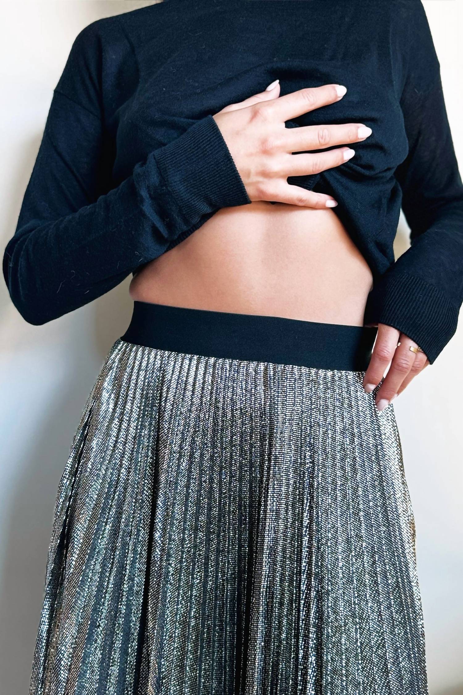 Show off just the right amount of skin in this beautifuly designed midi length skirt. Presenting the Classic Glitter Midi Skirt by Loyd/Ford, a statement piece in shimmering silver perfect for a New Year's Eve dinner party. Featuring a mid-calf length and elasticised waistband, this skirt is designed for both elegance and comfort. Made in the USA from 100% polyester with a sunray pleat, it embodies the Quiet Luxury trend. Closure: Pull-on.