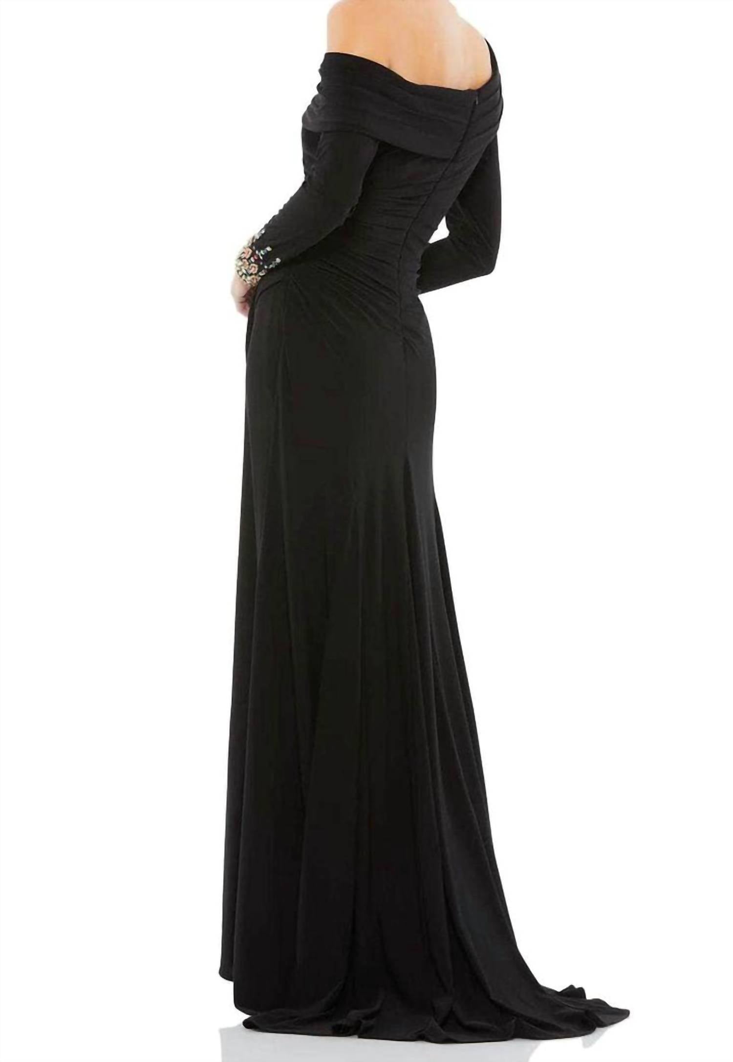 A maxi dress that is just as cute as it is comfortable. Introducing the stunning Beaded Cuff Drop Shoulder Long Sleeve Gown Dress by Mac Duggal, a masterpiece in elegant black. This off-the-shoulder gown features dazzling jeweled cuffs and a daring thigh-high slit, making it perfect for evening events. Crafted from 100% polyester, this full-length mermaid silhouette measures approximately 67" from top of shoulder to bottom and offers a flattering fit with bust pads for added support. Closure: Back zipper. Size 16 boasts a chest of 20.5" and a waist of 18".
