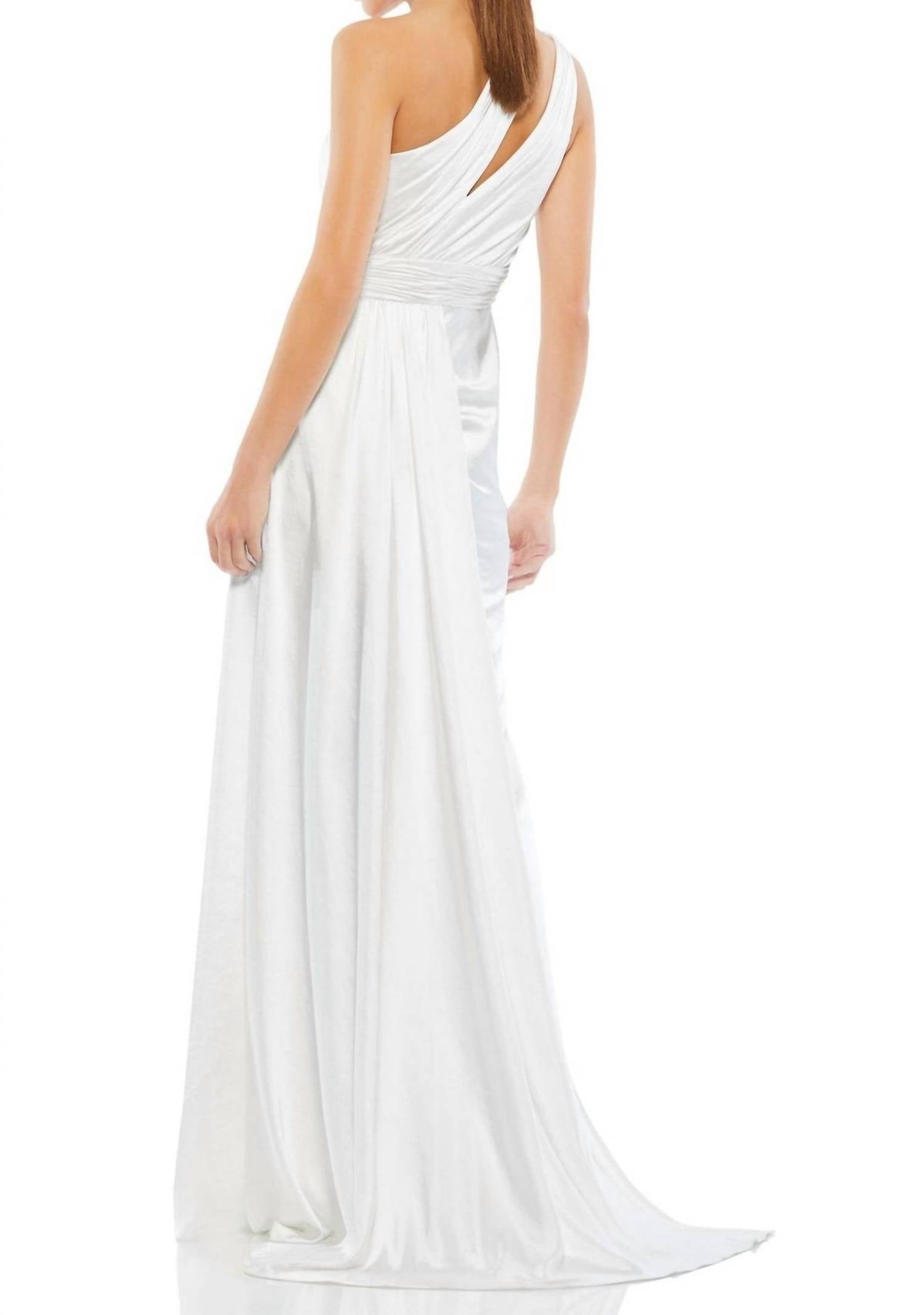 Who doesn't love a good maxi dress? This one you'll be reaching for season after season. Elevate your evening event look with the One Shoulder Cut Out Charmeuse Gown by MAC DUGGAL, a masterpiece of quiet luxury in timeless white. This sleeveless maxi dress, designed for women, showcases an elegant off-the-shoulder neckline and modern cut-out details. Composition: 100% Polyester. Closure: Convenient zip closure. Care: Spot or wipe clean for easy maintenance.