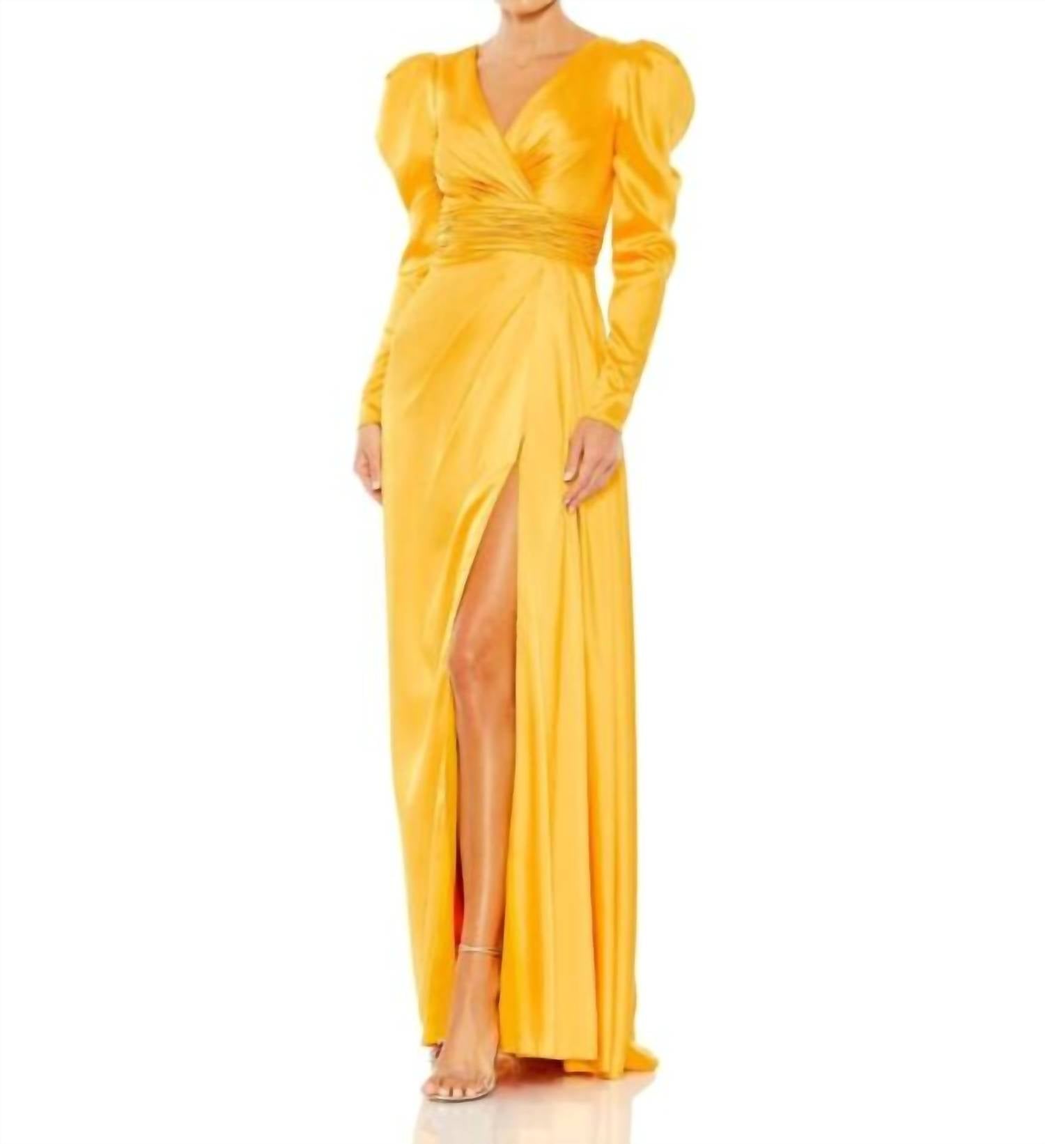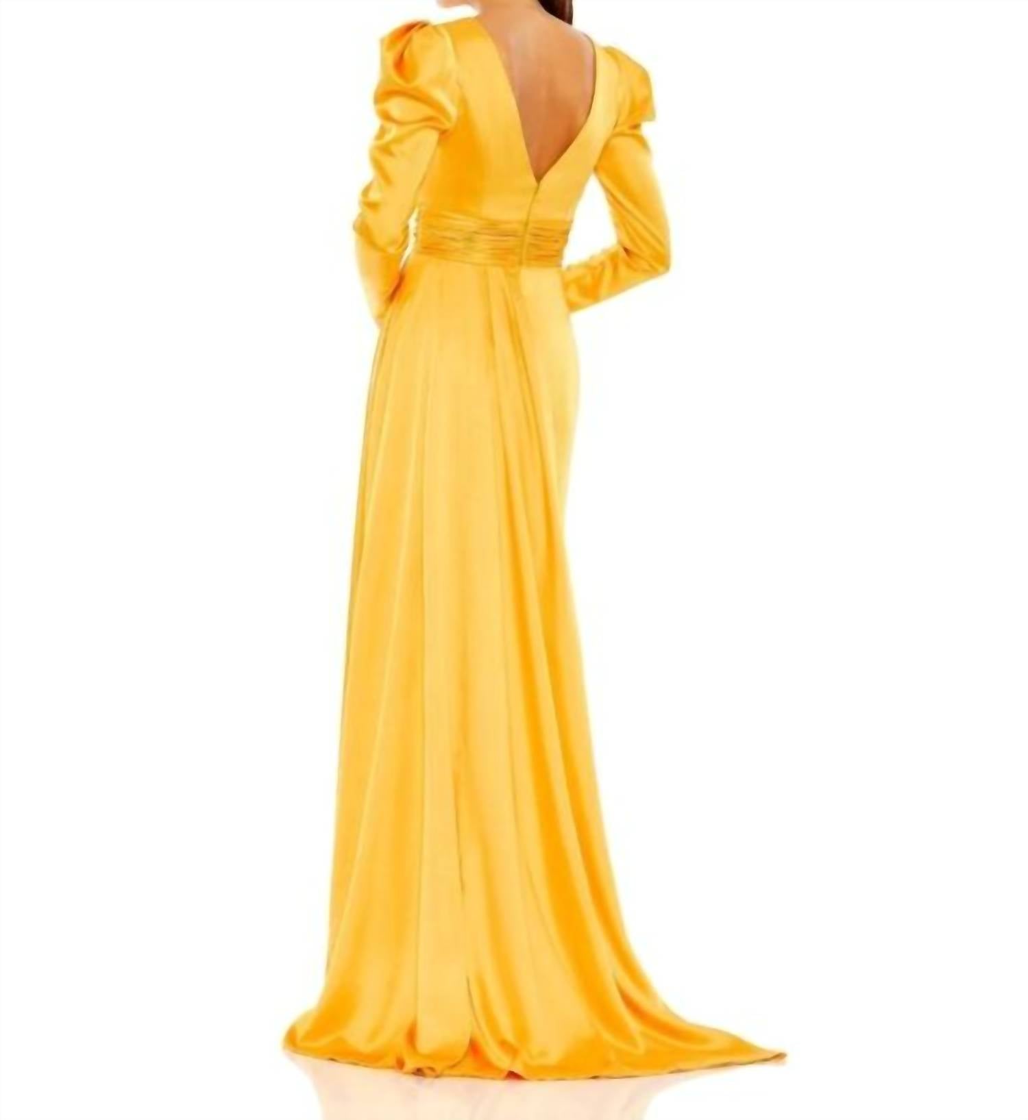 Style this maxi with your favorite statement necklace and sandals for the perfect look. The MAC DUGGAL V Neckline Long Puff Sleeves Maxi Column Gown is a luxurious choice for evening events, designed in a captivating mango hue. Crafted with long sleeves and a V-neck, this gown features a ruched surplice bodice and pleated A-line silhouette. The dress showcases a low V-back, thigh-high slit, and sweep train, complete with a side overlay for a dramatic effect. Closure: Zip closure. Elevate your spring wardrobe with this statement piece, embodying the quiet luxury trend.