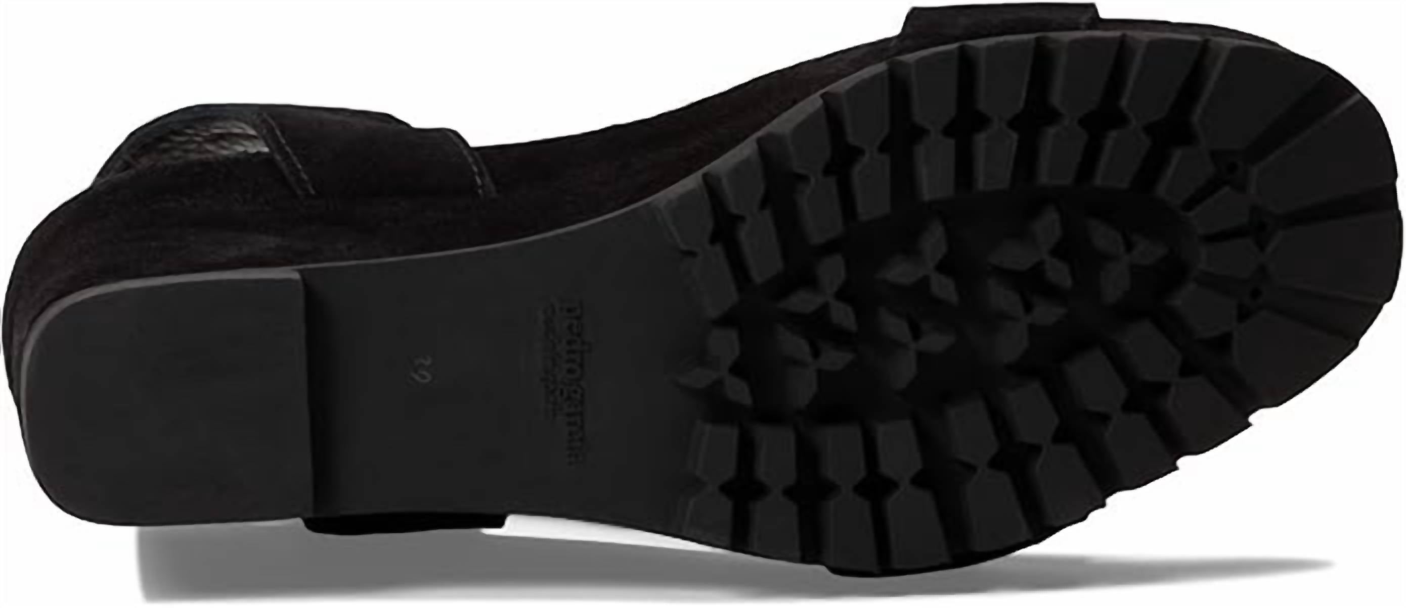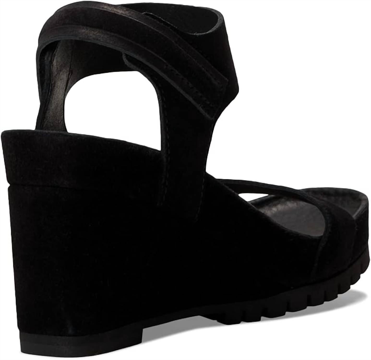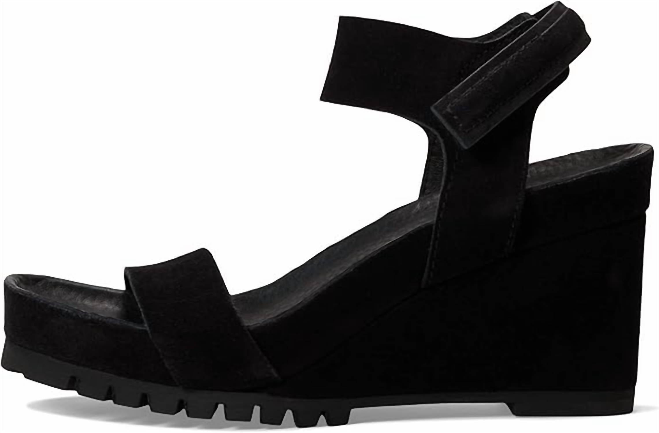 Classicly cute and all-day-wearable. We love this sandal. Step into elegance with the Josette Suede Wedge Sandals by Pedro Garcia, ideal for your next dinner party or New Year's Eve event. Crafted in Spain, these black sandals feature a platform wedge silhouette and a durable synthetic outsole, complemented by a suede upper and leather lining. The design includes a convenient hook-and-loop adjustable ankle strap for a secure fit. With a high heel height of 3 1/4 inches and a round toe shape, they're perfect for adding a minimalist touch to your spring wardrobe.