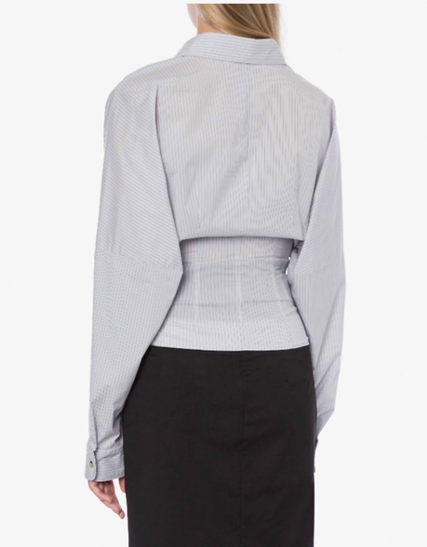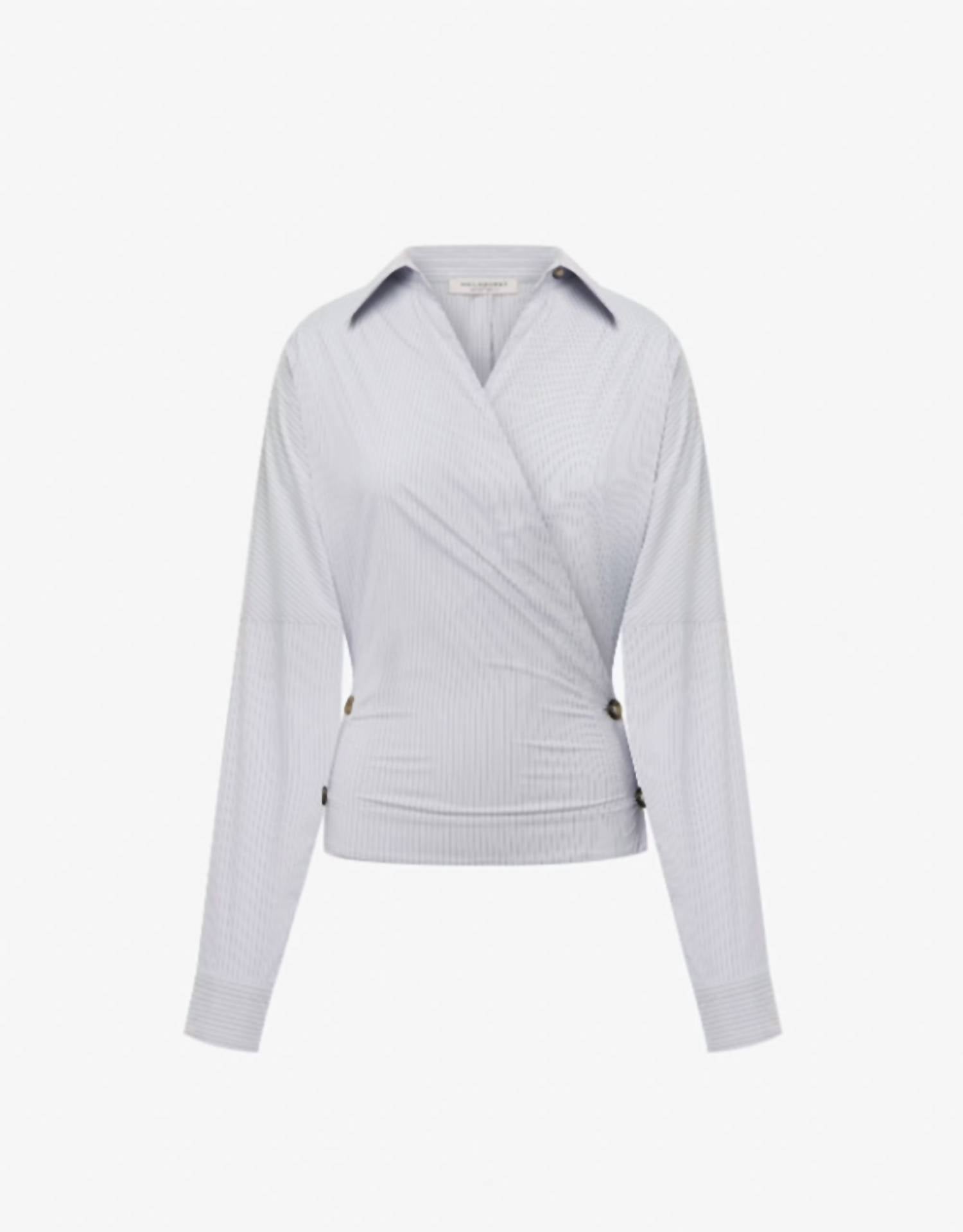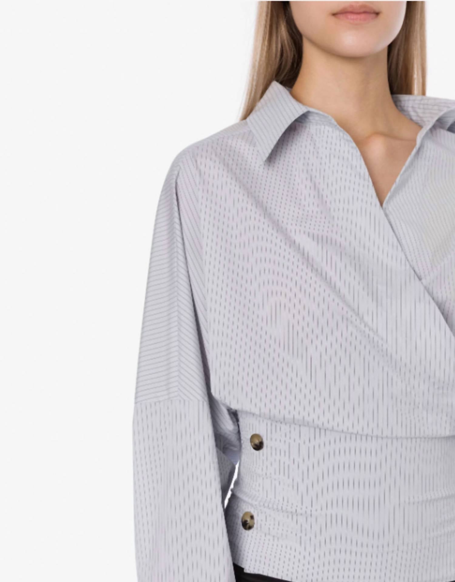 Pair this with your favorite jeans and slides for your next girls night out. Discover the Stretch Taffeta Shirt With Buttons by Philosophy di Lorenzo Serafini, a chic addition to any wardrobe with its elegant blue stripe pattern. This blouse boasts long sleeves and a flattering wrap design with a V-neckline for a modern twist on classic style. Its relaxed fit is accentuated by side buttons, creating a close-fitting silhouette at the bottom. Perfect for adding a touch of sophistication to your ensemble.