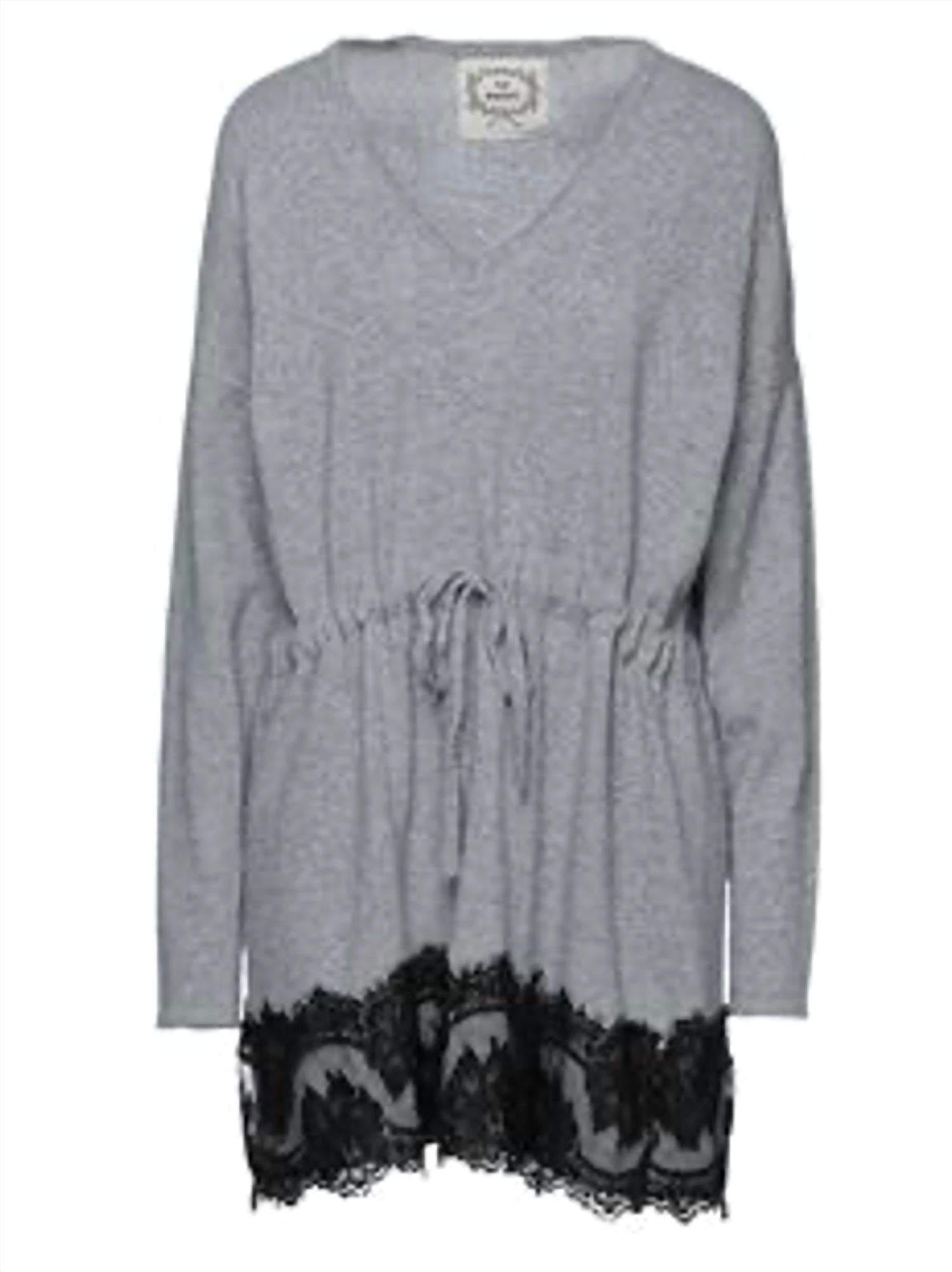 A short and breezy dress for those warmer days. This lightweight knitted dress features a delicate two-tone design with elegant lace trims for a refined touch. It has a flattering V-neckline and long sleeves, offering a balanced blend of coverage and style. Unlined and designed without pockets, the dress maintains a streamlined silhouette. Crafted from a soft, luxurious blend of merino wool, viscose, polyamide, cashmere, and cotton, it provides a comfortable and breathable feel with a gentle drape.