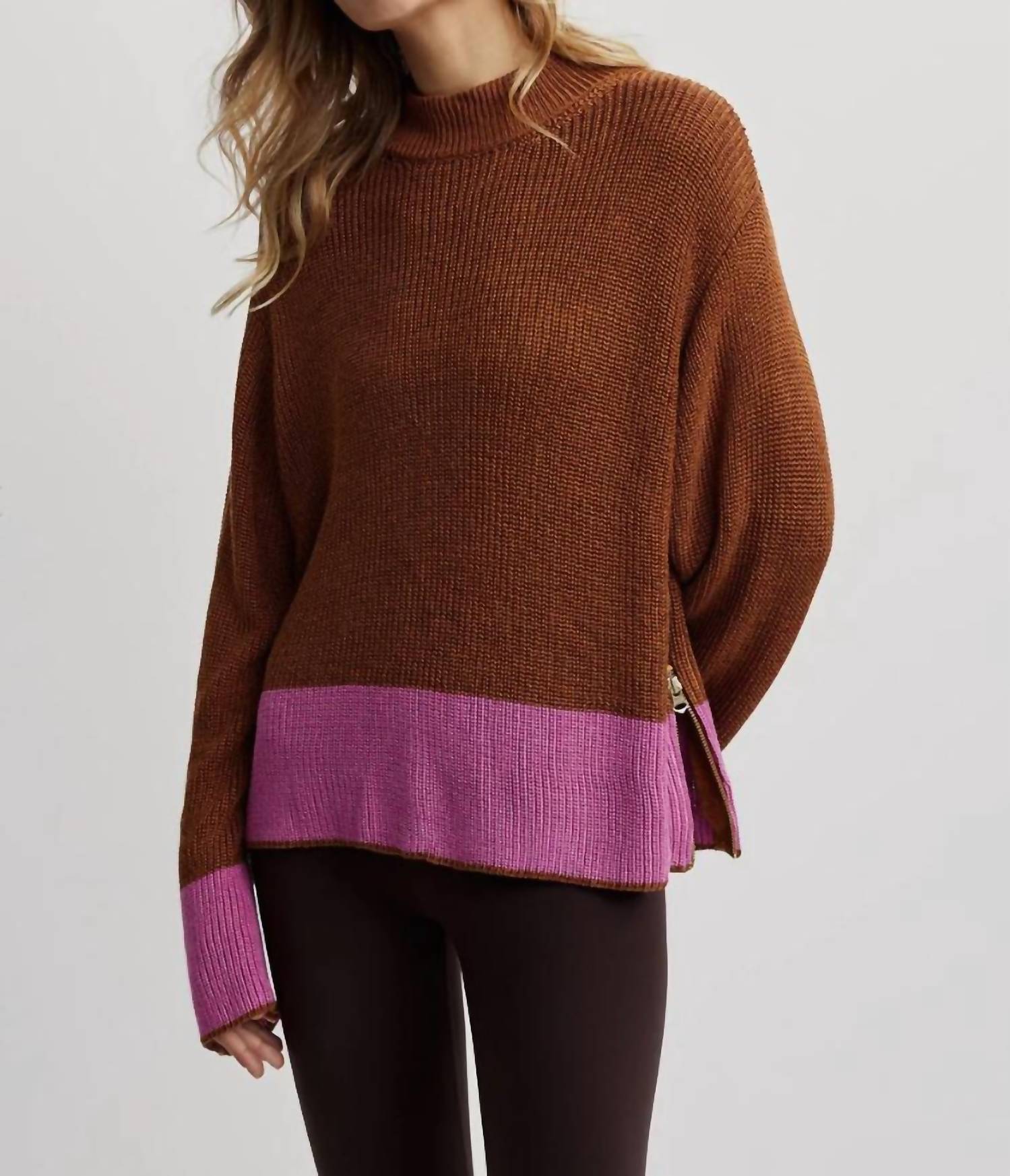 Stay warm and stylish in this versatile and effortlessly cool knitwear staple. Wear it alone or layered, it's the perfect sweater for the season and you'll wish you had it in every color. A color-block knitted pullover made for layering or as a stand-out piece, it’s a versatile top that pairs well with any pants – so you can rock the exact look that you want, no matter the weather. The Varley Panama Knit features a ribbed knit blend of acrylic, rayon, and viscose and highlights a luxurious, boxy drape that flatters any body type. It’s flowy enough to ensure that you feel comfortable as you move through your day, and also lends that effortless style to the garment. It also comes with a stand collar, some dropped shoulders, and a mock neck to add structure and personality to your look. This sweater reaches up to the hips, which creates the illusion of a longer upper torso. Pair it with your favorite ankle-length tapered jeans to balance the relaxed fit. Materials: 41% acrylic, 37% rayon, and 22% viscose. Care instructions: Machine wash on a cold, gentle cycle. No dry cleaning, tumble drying, or bleaching. Cool iron.