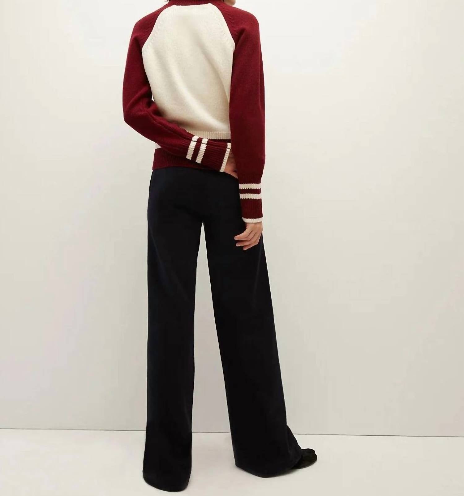 Contrast striped trim. Crew neck. Long sleeves. Dry clean. 80% Wool, 20% Nylon.