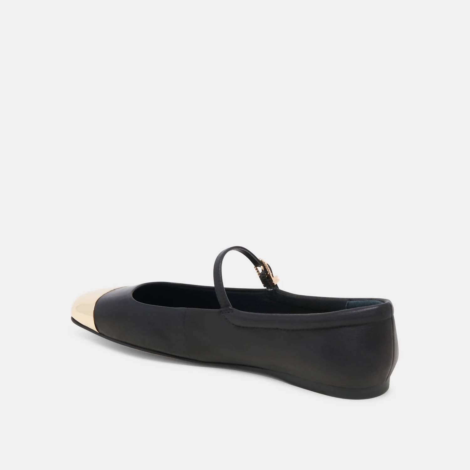 Minimalist's dream in elegant black features a metallic dipped toe that sets this timeless ballet flat apart. Enjoy the classic ballet flat silhouette complemented by a leather upper and a squared toe shape. Feature a recycled synthetic outsole and a water-based leather alternative sock for sustainability. Comfortable flat (1" & under) heel height. Imported and crafted with a textile lining. Effortlessly blend understated style and eco-friendly elements.