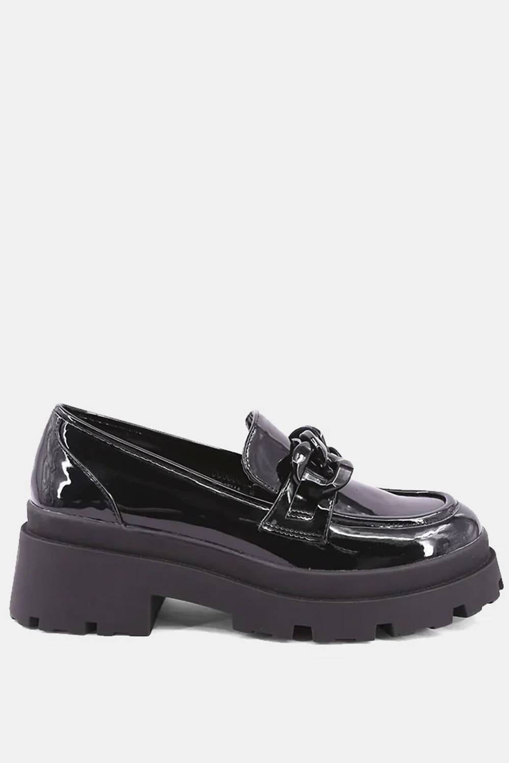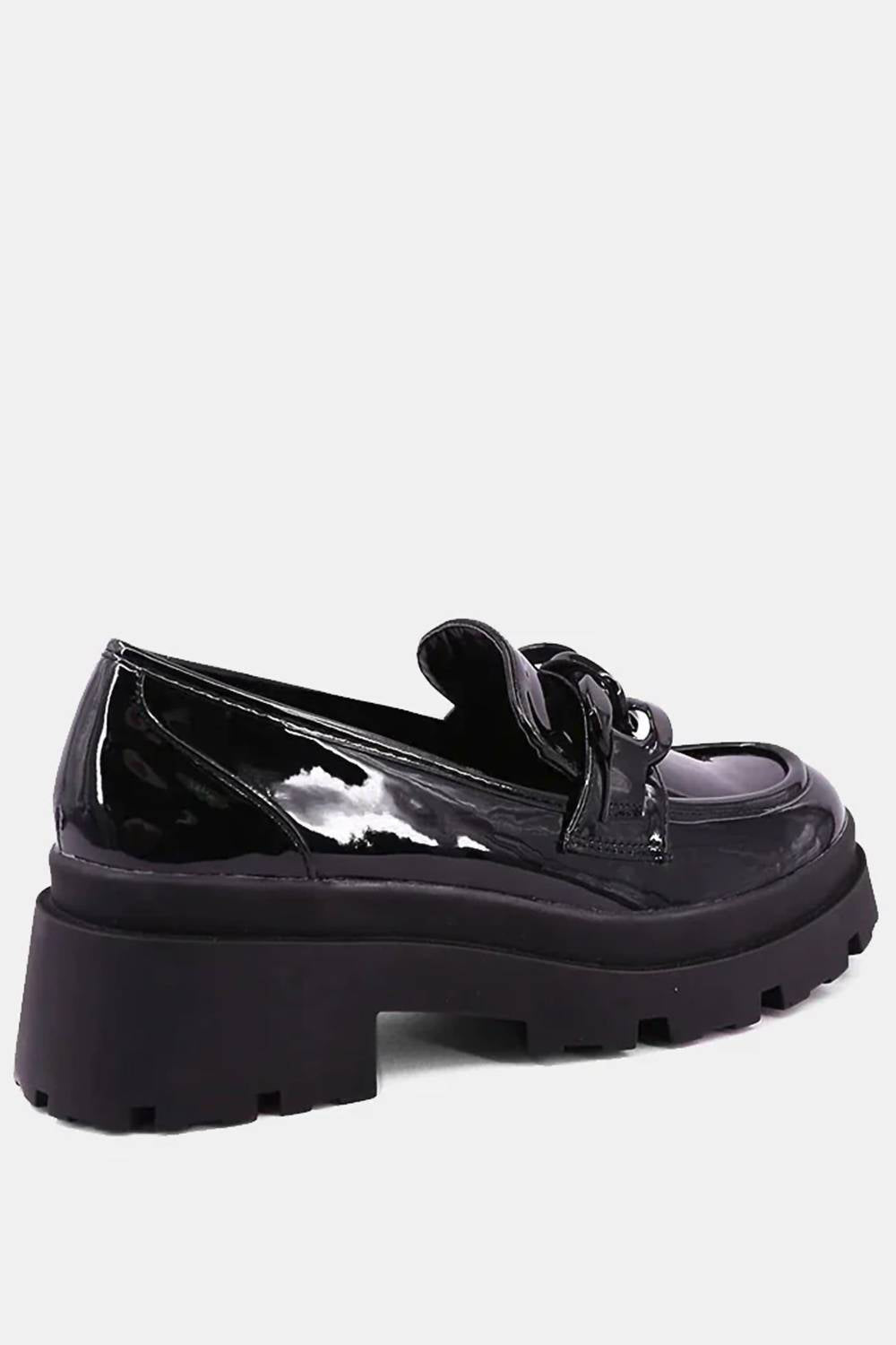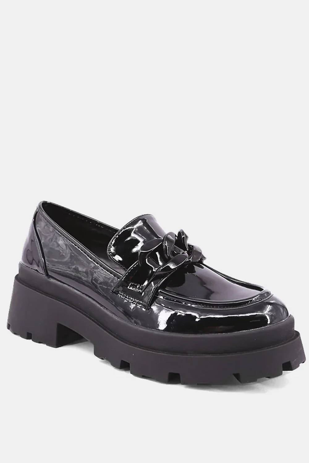 A preppy yet feminine take on the classic loafer. Introducing the Talitha Loafer by SHU SHOP, a chic nod to '90s fashion with a modern twist. These loafers feature a round toe design in sleek black, crafted from faux patent leather for an eye-catching finish. An attention-grabbing retro sole and chain embellishments make these shoes a standout addition to any wardrobe. Perfect for adding a glam update to your look, they effortlessly serve as a versatile anchor for bright ensembles.