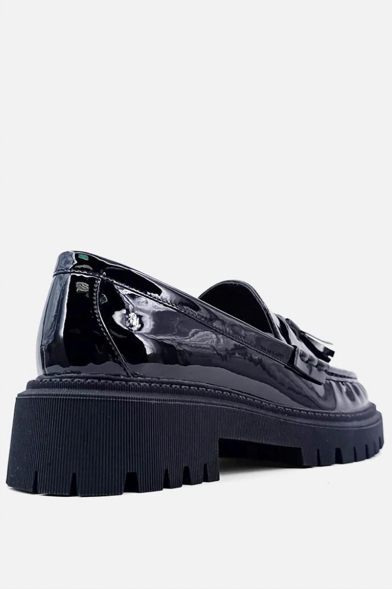 A classic loafer that is both comfortable and polished. Elevate your footwear collection with the Women's Taylor Tassel Loafer by SHU SHOP, a perfect fusion of elegance and contemporary style. These loafers, constructed from high-quality faux black glossed leather, boast a platform rubber sole that provides subtle height while ensuring comfort. Timeless topstitched lines, classic tassels, and fringing lend sophistication to this versatile piece, easily paired with straight-leg jeans or tailored pants. Ideal for any occasion, they embody both style and functionality with a chic round toe design.