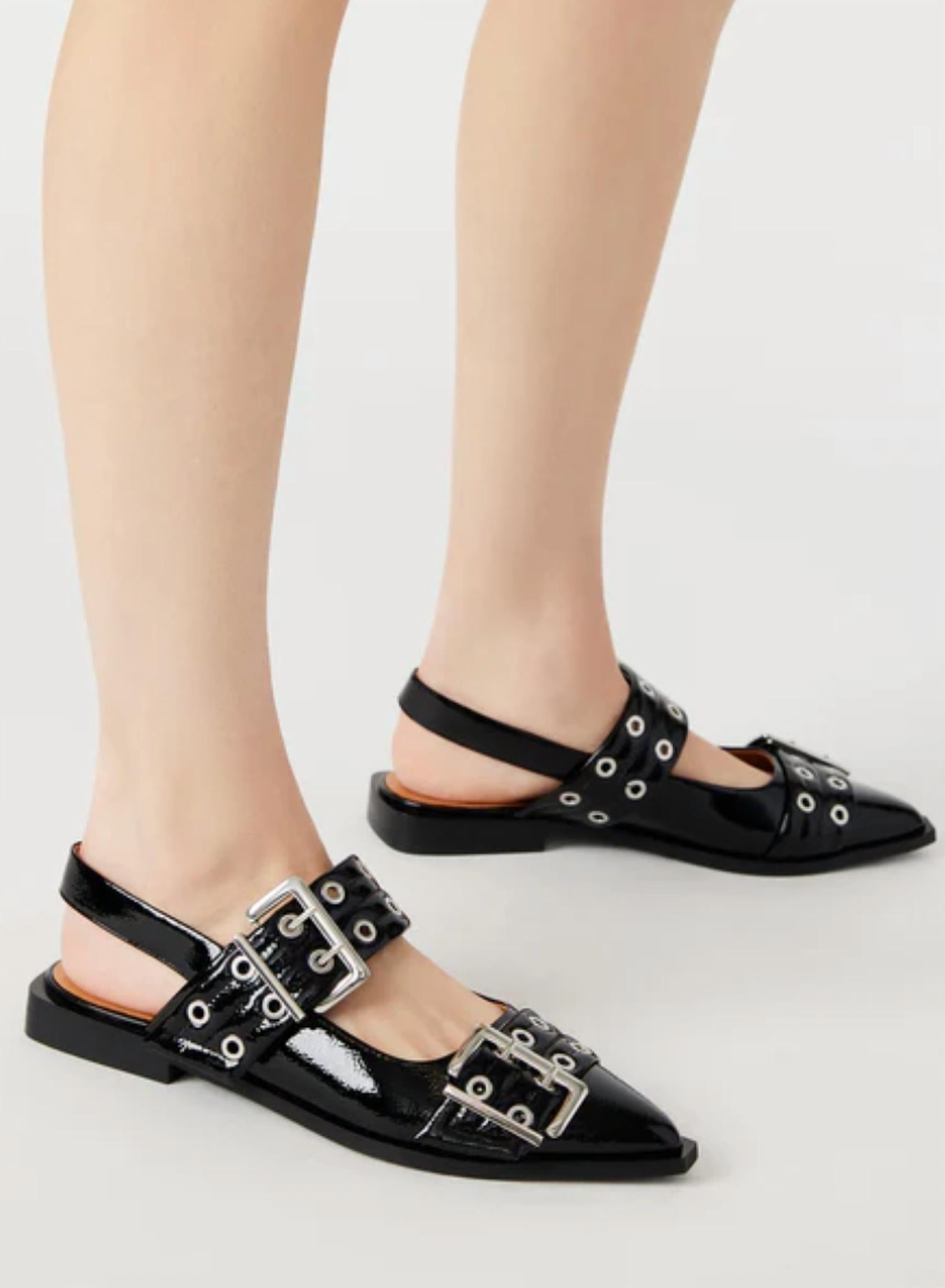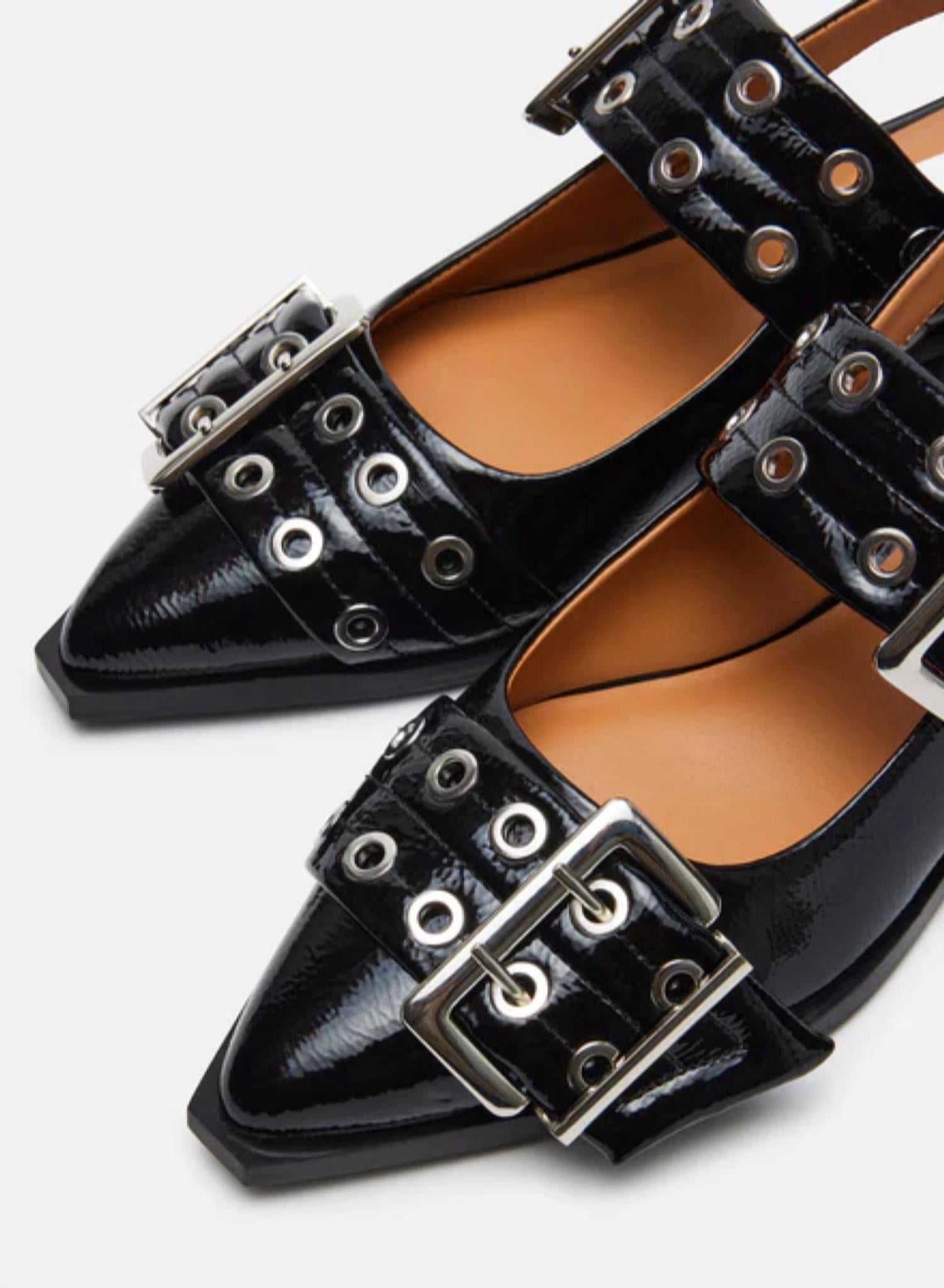 A preppy yet feminine take on the classic loafer. Elevate your footwear collection with the Steve Madden Women's Graya Grommets Flats in Black Patent, featuring a striking angular silhouette. Crafted with wide grommet straps and oversized buckle hardware, these flats exude edgy sophistication. The synthetic upper material paired with a leather lining ensures comfort, while the synthetic sole supports the low 0.75-inch block heel. Imported with a snipped toe design, these slingbacks are an exceptional choice for modern style.