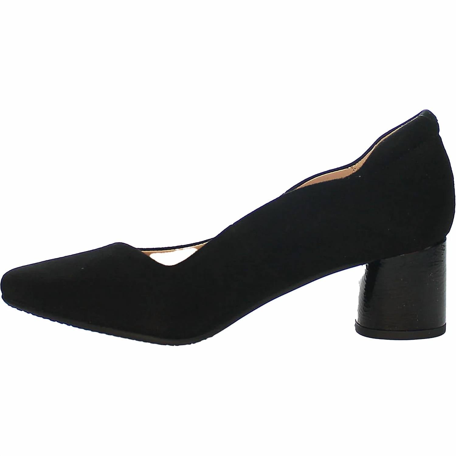 Introducing the Evelyn Pump by Bella Comforto, a sophisticated heel that combines luxe suede uppers with a patent leather wrapped 2" column heel exuding elegance. This model boasts a subtly scalloped silhouette, an asymmetric vamp, and a pointed almond toe for a unique yet refined look. Crafted with richly padded insoles and built-in arch support, it ensures pillow-soft comfort with every step. Proudly handcrafted in Portugal, this black heel is a stylish addition to any wardrobe.