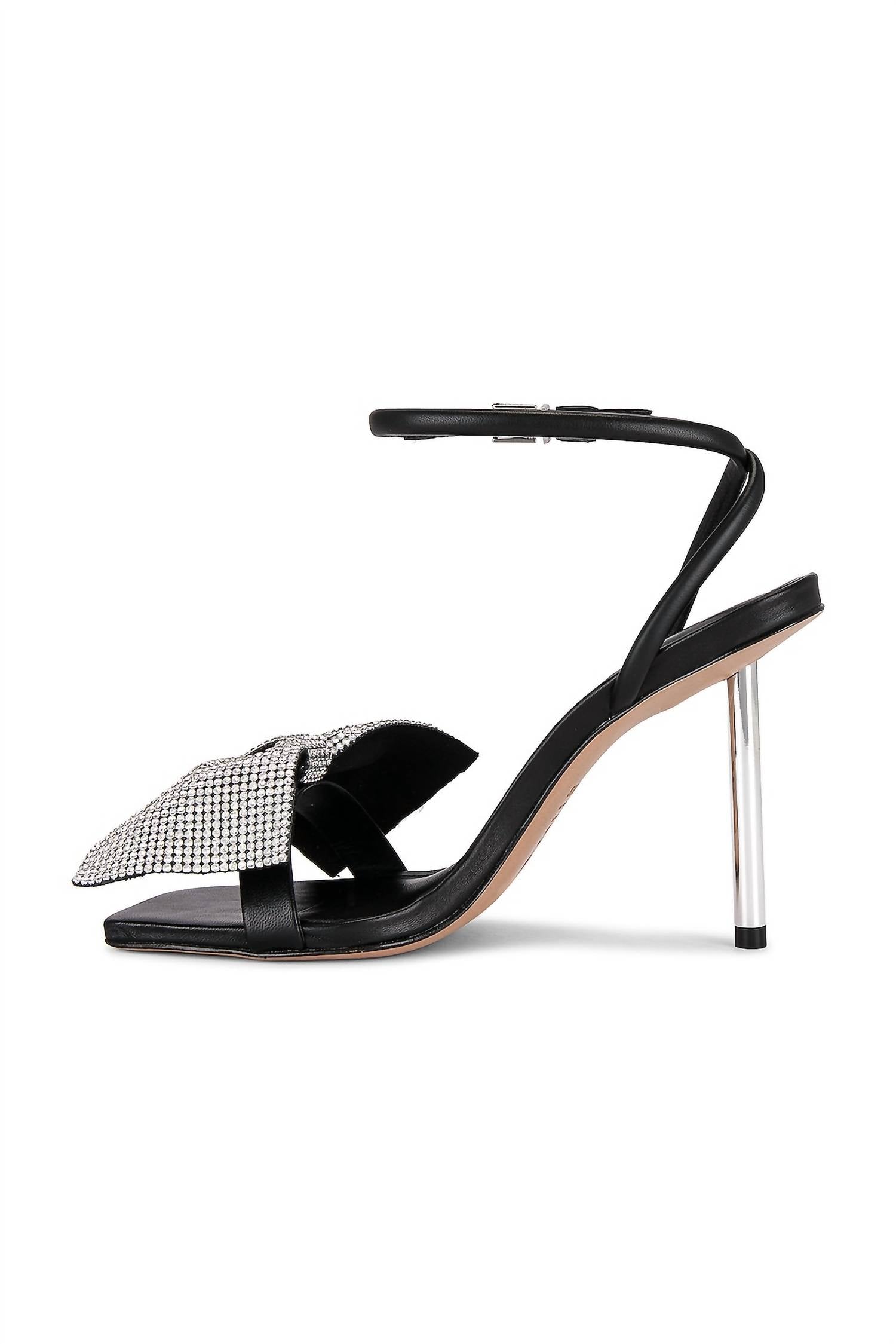 Don't be deceived, these heels are comfy as can be. Featuring a crystal and leather upper paired with a leather sole, this elegant shoe showcases a statement crystal-embellished bow at the vamp. It includes an ankle buckle closure for a secure fit, a leather footbed and lining for comfort, and a slanted square toe complemented by a stiletto heel for a sophisticated finish.