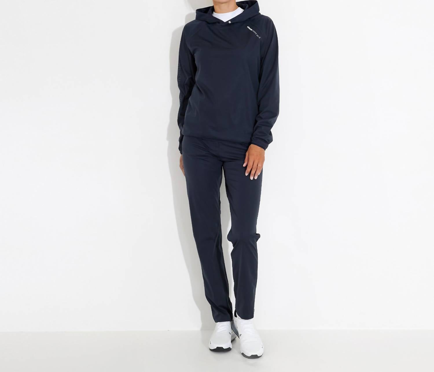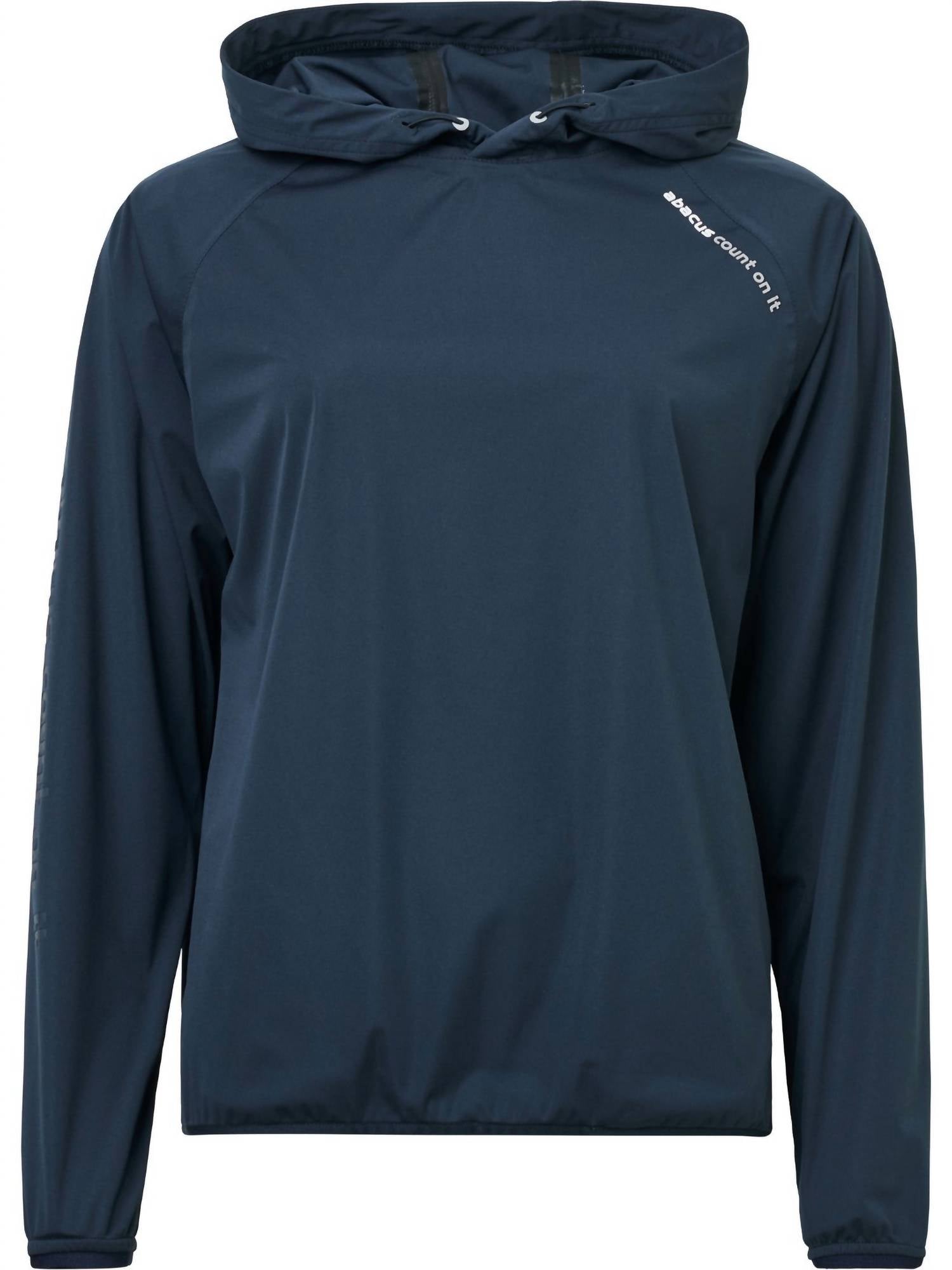 Whether you're running around town or lounging at home, this sweatshirt works for both. Elevate your golf attire with the Bounce Waterproof Golf Hoodie by Abacus Sportswear US, designed for women who refuse to let the rain dampen their game. Featuring long sleeves and crafted from a lightweight 3-layer fabric, this hoodie offers superior comfort with its 4-way stretch material. It boasts 15,000 WP waterproofing and 15,000 MWP breathability, keeping you dry and allowing moisture to escape, and has a practical pull-on closure for ease. Ideal for fall game days, this solid navy hoodie with a stylish hooded neckline includes two front pockets, and care is simple with machine wash and line dry instructions.