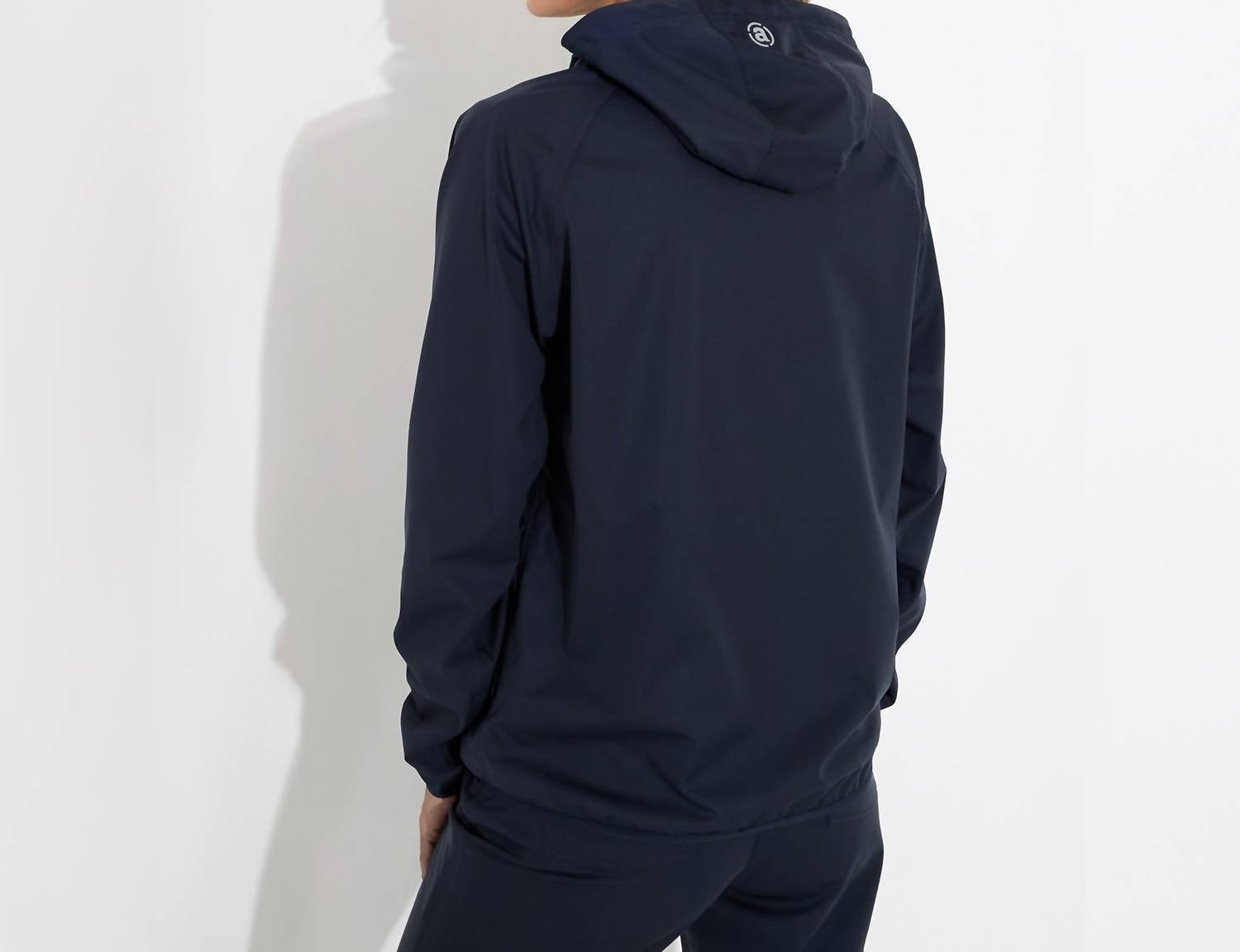 Elevate your golf attire with the Bounce Waterproof Golf Hoodie by Abacus Sportswear US, designed for women who refuse to let the rain dampen their game. Featuring long sleeves and crafted from a lightweight 3-layer fabric, this hoodie offers superior comfort with its 4-way stretch material. It boasts 15,000 WP waterproofing and 15,000 MWP breathability, keeping you dry and allowing moisture to escape, and has a practical pull-on closure for ease. Ideal for fall game days, this solid navy hoodie with a stylish hooded neckline includes two front pockets, and care is simple with machine wash and line dry instructions.