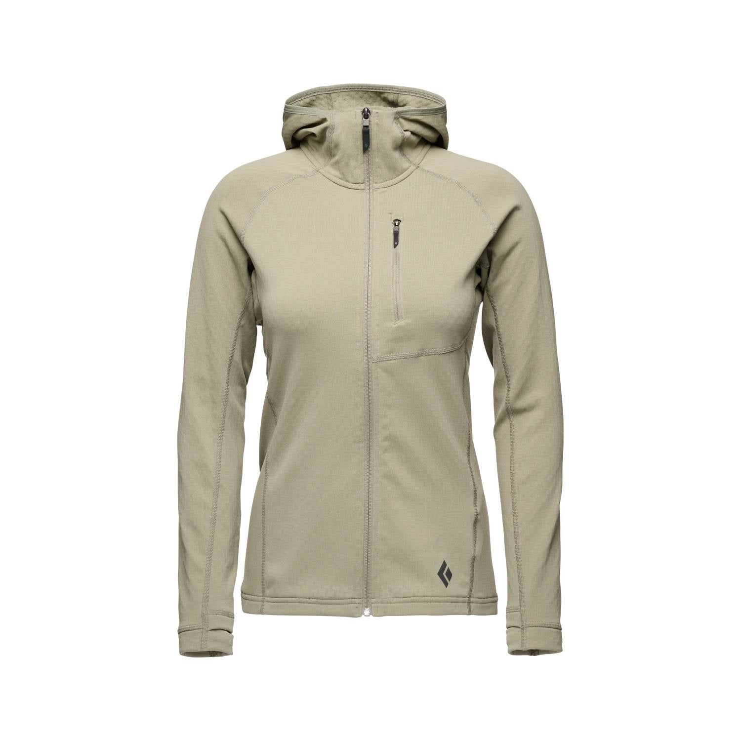 Cooler temps call for layering and we love this adorable sweatshirt for all the obvious reasons. Introducing the Coefficient Hoody by Black Diamond, a must-have for women who love winter fitness and athleisure fashion. Designed with long sleeves and a hooded neckline, this hoody is crafted from Polartec Power Grid Fleece, combining 51% Polyester, 36% Nylon, and 13% Elastane for optimal warmth and breathability. It features a convenient zip closure and a zip chest pocket for practicality. Made in El Salvador, this solid color fig hoody is easy to care for with machine wash and lay flat to dry instructions. The lightweight cuffs with thumb loops and under-the-helmet hood make it perfect for ski tours and alpine ascents.