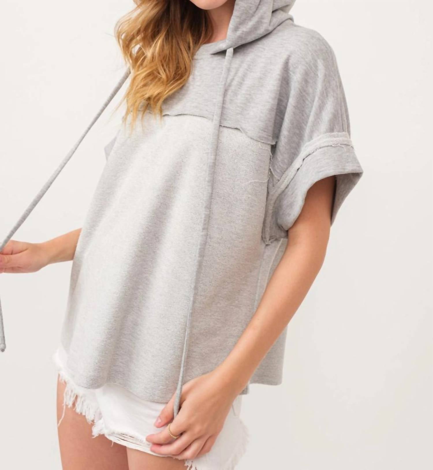 Whether you're running around town or lounging at home, this sweatshirt works for both. The Kara Raw Edge Hoodie by Ces Femme is a stylish choice for women seeking a minimalist, yet chic addition to their spring wardrobe. This solid grey hoodie features a hooded neckline and short sleeves, crafted from a comfortable cotton blend. With its pull-on closure, it's perfect for easy wear during holiday gatherings or casual outings. Ideal for pairing with jeans or shorts, this piece is unlined and designed without pockets for a streamlined look.