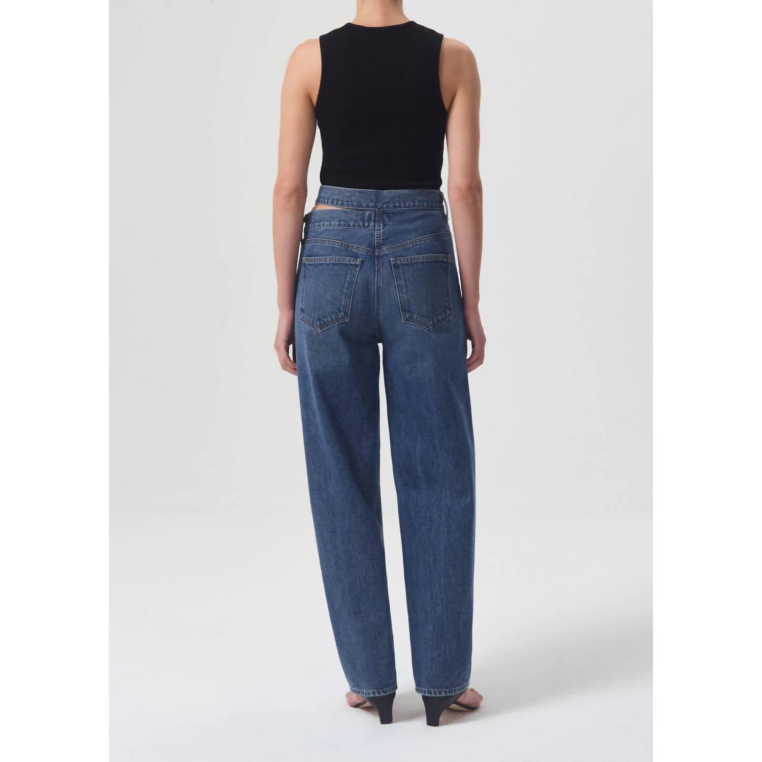 Pair these straight leg jeans with flats, sandals or even heels! You can't go wrong. Discover the AGOLDE Broken Waistband Jeans in an eye-catching medium wash Intrigue shade, designed for streetwear-inspired style. Crafted from 100% organic cotton, these high-rise, straight-leg jeans offer a relaxed fit and feature a distinctive broken-waistband cut-out detail. With a button fly closure, minimal stretch, and contrast stitching, these jeans are both edgy and comfortable. Care is easy: machine wash cold inside out with like colors, do not bleach, and tumble dry low.