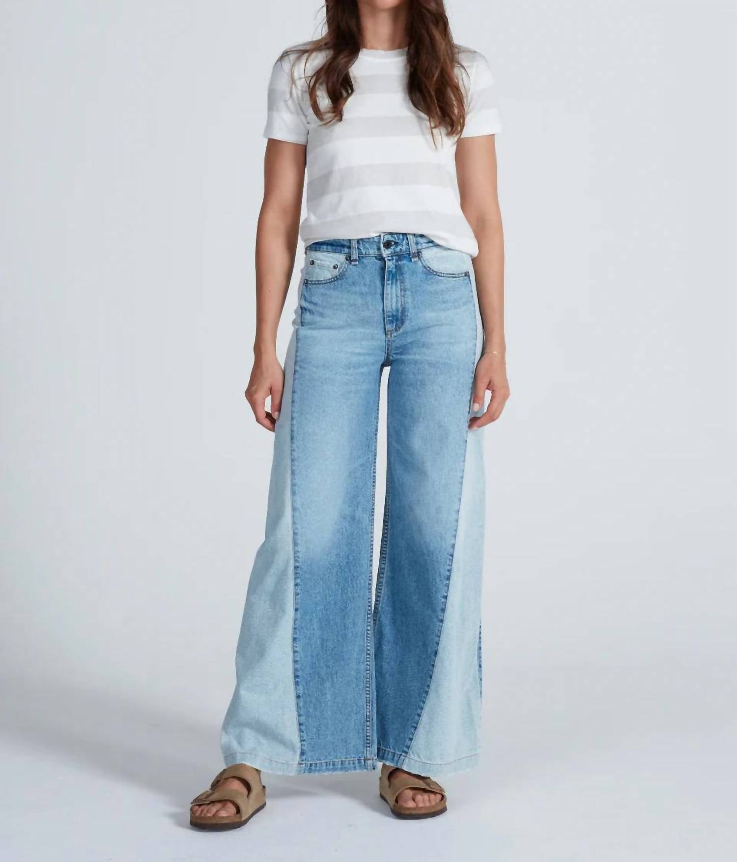 Pair these wide leg jeans with mules, slides or your favorite strappy sandals. Step into summer with the ASKK NY Barcelona Jean, featuring a high rise and a relaxed, wide-leg fit that pays homage to 90s fashion. Crafted from 100% Japanese cotton, these pants boast a medium Berkeley wash, contrast denim panel, and subtle flare that ensures you stand out effortlessly. With a full-length 31-inch inseam and a traditional button closure, these jeans offer both comfort and style for any vacation occasion. Made in Los Angeles, care for them by machine washing cold separately and avoiding the tumble dryer.