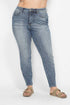 The High Waist Tummy Control Contrast Wash Skinny Jeans by Judy Blue offer a flattering fit and modern style in a medium wash. These high-rise jeans feature a tummy control panel for added confidence and a sleek silhouette. Designed with a button closure, they are crafted from a cotton blend (91% cotton, 7% polyester, 2% spandex) for comfort and stretch, with a 29" inseam. Imported and machine washable, they feature a pocketed design for practicality, making them perfect for various occasions from casual to dressy.