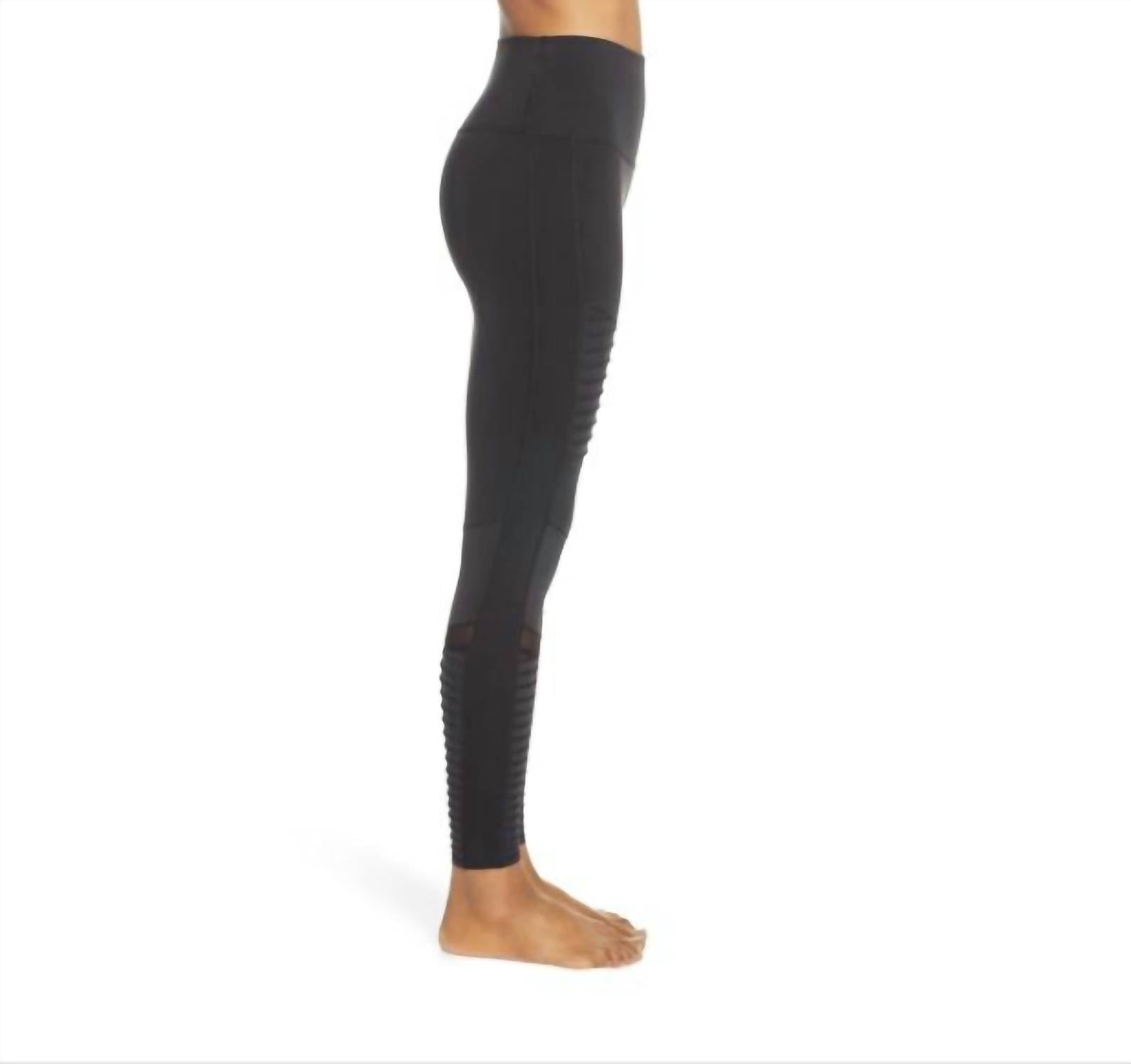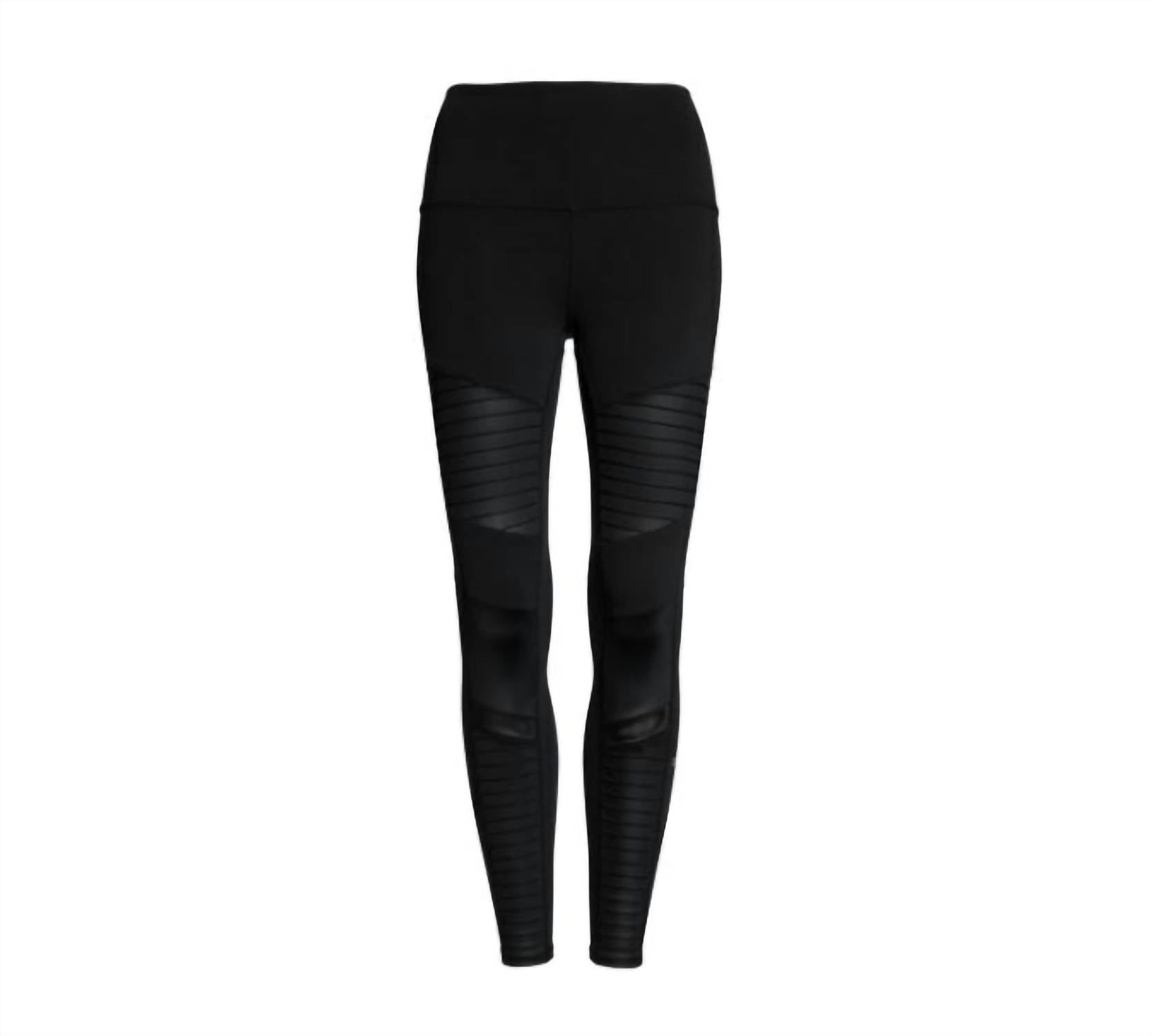 The legging you didn't know you needed and you won't want to take off. Elevate your activewear collection with the High Waisted Moto Leggings by ALO YOGA. These women's leggings boast a chic moto aesthetic, featuring pintucked panels and a seamless, figure-flattering design. Crafted from a durable 87% Nylon and 13% Spandex blend, they ensure comfort with a wide elastic waistband and smooth flatlock seaming. High-rise with an inseam of 24.5", a front rise of 9.25", and a leg opening of 8.5" at the hip, these black leggings are pull-on style, offering a sleek and stylish skinny leg silhouette. Hand wash and dry flat to maintain their perfect fit.