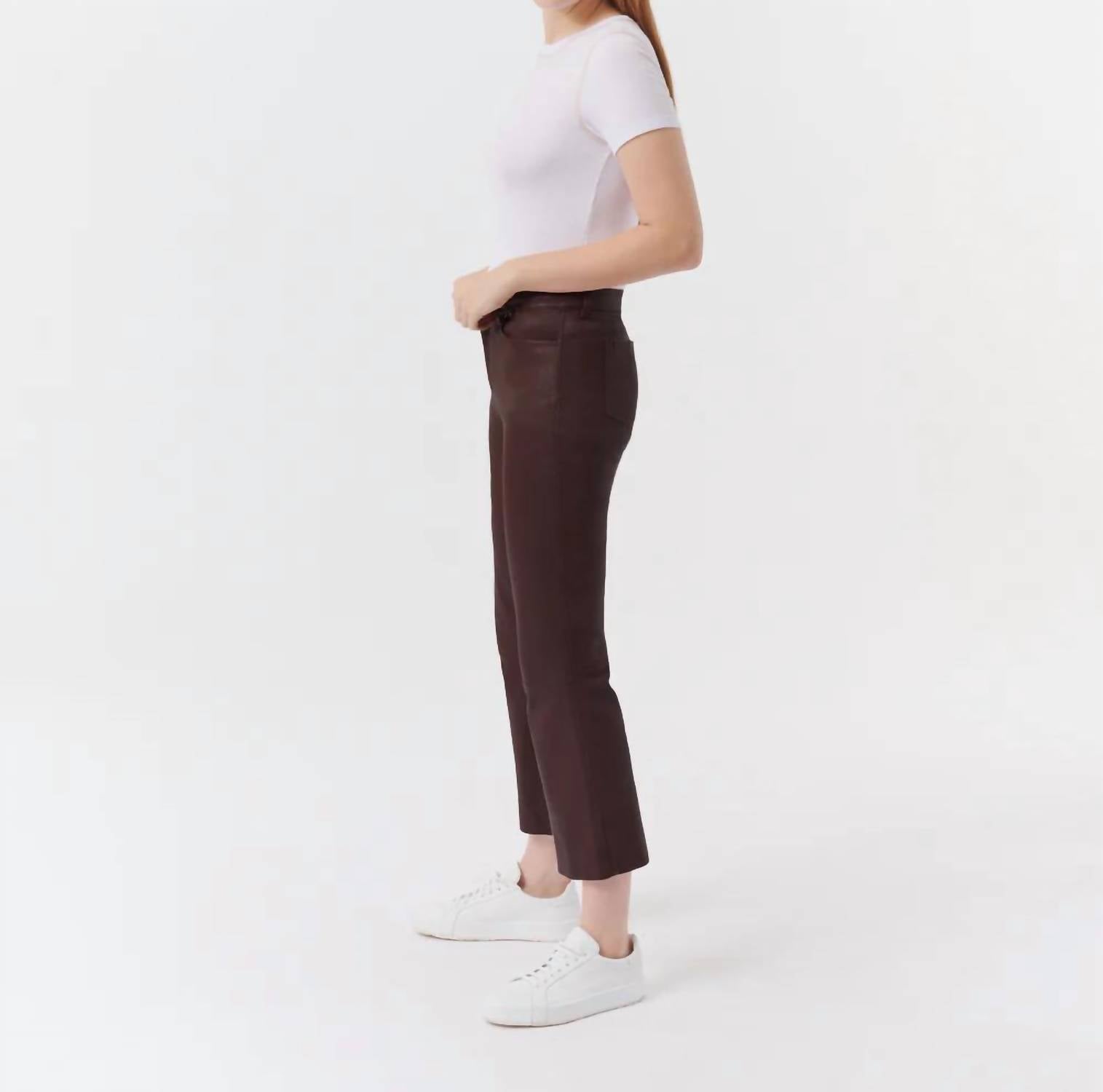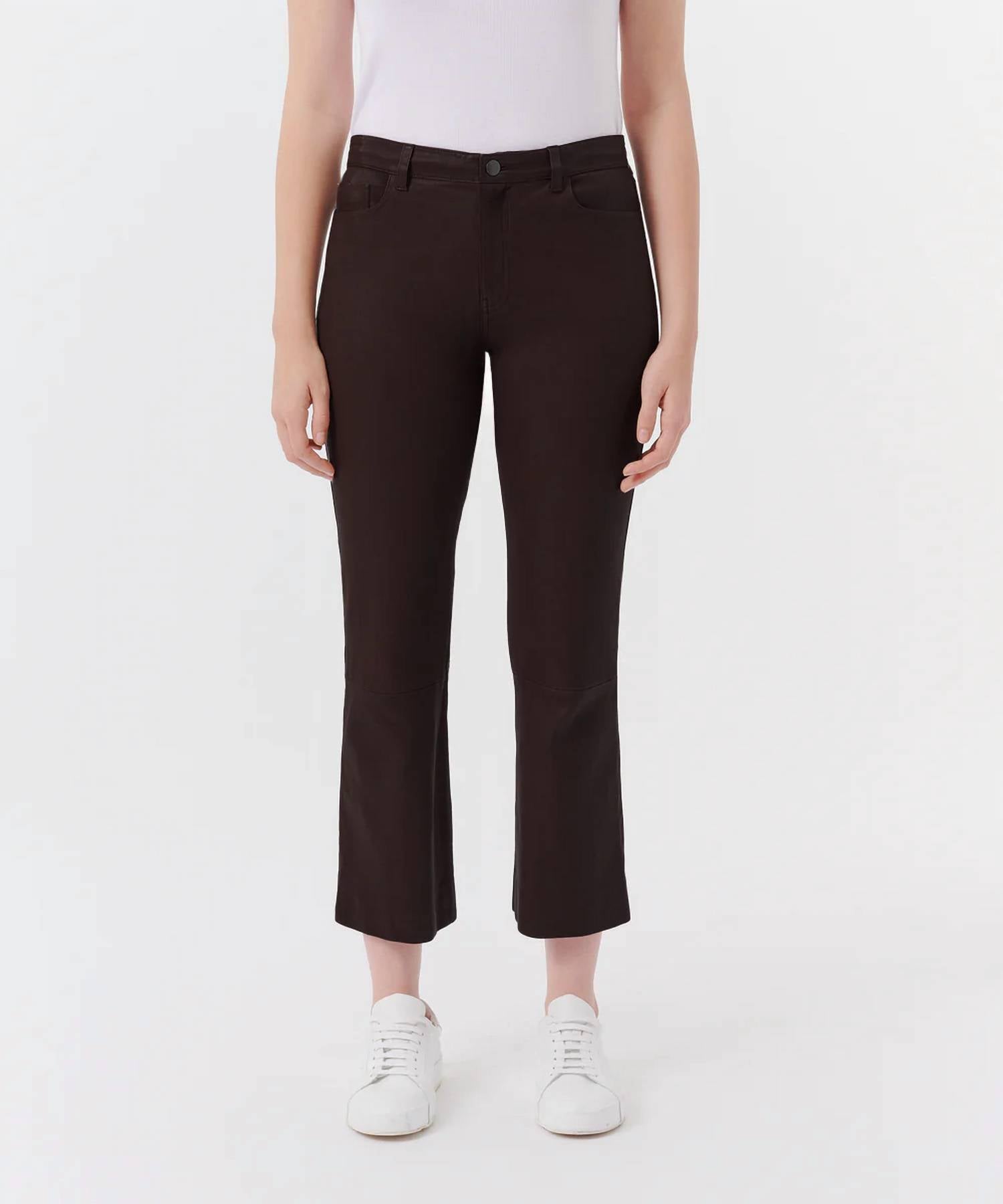 Slightly flared pants are all the rage right now and these are no exception. Pair these with your favorite tee for a more casual look, or with your favorite button-up blouse for an evening out. Comfortable style crafted from soft 100% lamb leather. Feature a hip-hugging, straight silhouette that opens up below the knees and stops just above the ankles. Face: 100 % Lamb Leather/ Back: 97% Cotton 3% Spandex. Professional leather cleaning only.
