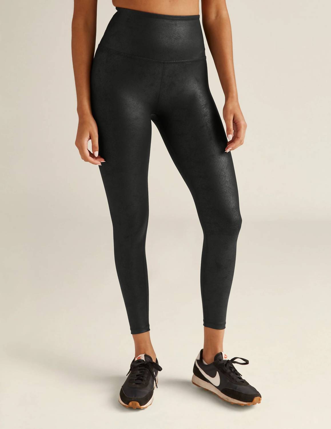 The legging you didn't know you needed and you won't want to take off. Experience the perfect blend of luxury and comfort with the BEYOND YOGA Spacedye Caught In The Midi Leatherette Leggings in Black Foil. These high-waisted faux leather leggings feature a pull-on closure and a 5” waistband, offering a flawless and elongating silhouette with no outseams. Crafted from polyamide, these leggings have a slim fit and a midi length that falls between the calf and ankle. Care is easy with machine wash instructions, making these leggings a versatile and flattering choice for any occasion.
