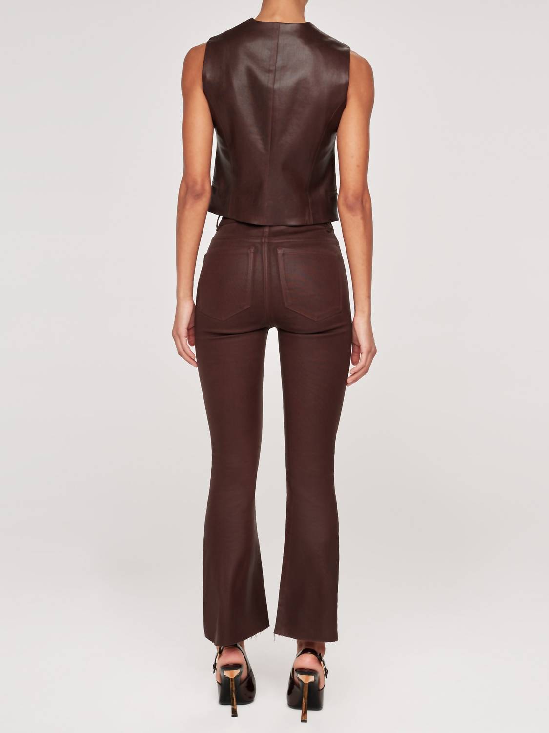 Elevate your fall wardrobe with the Bridget Bootcut High Rise Instasculpt Cropped Jeans by DL1961, crafted for seamless vacation style in a rich Chestnut hue. Designed with a bootcut leg and a chic high rise, these jeans offer a perfect 27" inseam and a 10" rise. The solid cotton blend features a premium composition of 62% TENCEL Lyocell, 23% Cotton, 14% Elasterell-p, and 1% Lycra, ensuring both comfort and durability. Closure: Button closure. Care: Dry clean only.